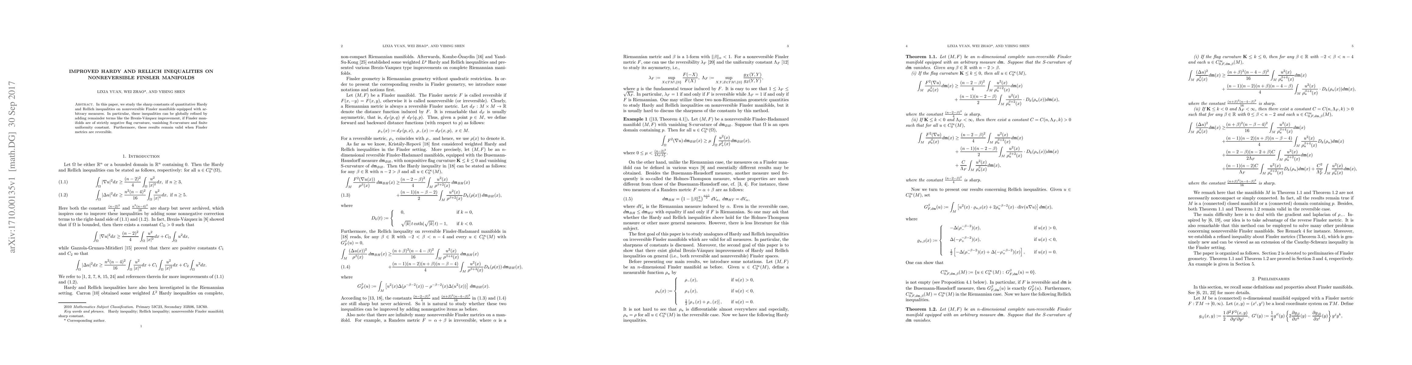 In this paper, we study the sharp constants of quantitative Hardy and Rellich inequalities on nonreversible Finsler manifolds equipped with arbitrary measures. In particular, these inequalities can be globally refined by adding remainder terms like the Brezis-V\'azquez improvement, if Finsler manifolds are of strictly negative flag curvature, vanishing S-curvature and finite uniformity constant. Furthermore, these results remain valid when Finsler metrics are reversible.