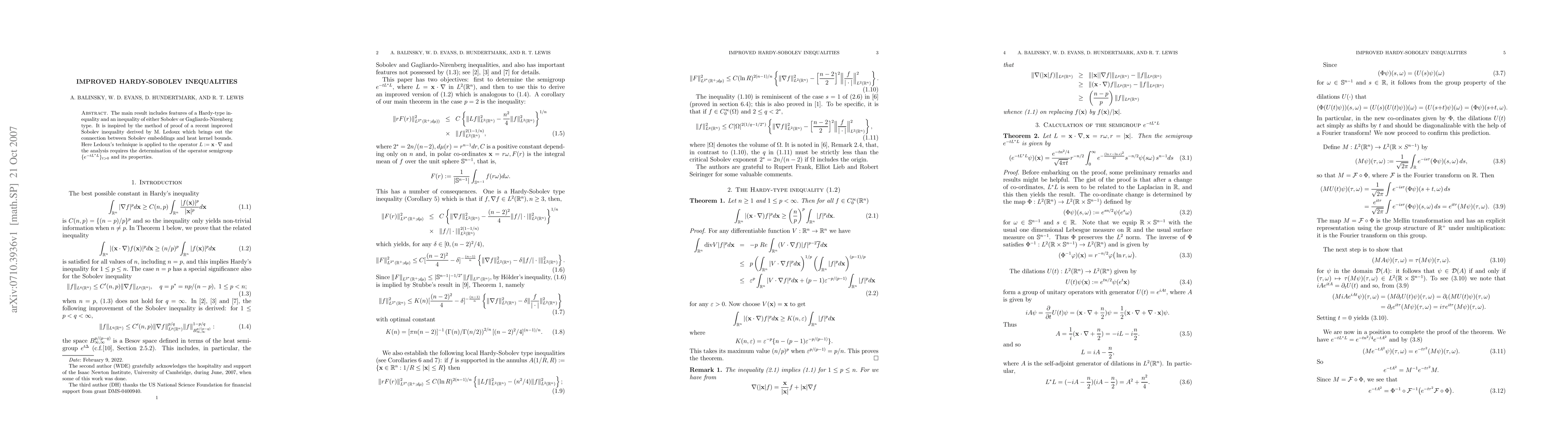 The main result includes features of a Hardy-type inequality and an inequality of either Sobolev or Gagliardo-Nirenberg type. It is inspired by the method of proof of a recent improved Sobolev inequality derived by M. Ledoux which brings out the connection between Sobolev embeddings and heat kernel bounds. Here Ledoux's technique is applied to the operator $L:= {\bf{x}} \cdot \nabla$ and the analysis requires the determination of the operator semigroup $\{e^{-tL^{*}L}\}_{t>0}$ and its properties.