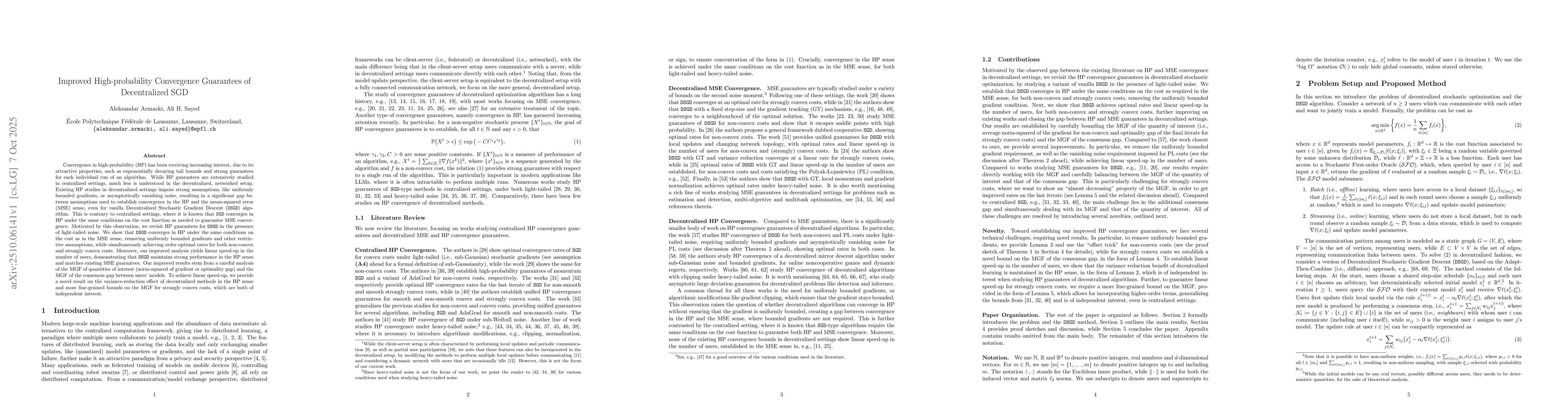 Convergence in high-probability (HP) has been receiving increasing interest, due to its attractive properties, such as exponentially decaying tail bounds and strong guarantees for each individual run of an algorithm. While HP guarantees are extensively studied in centralized settings, much less is understood in the decentralized, networked setup. Existing HP studies in decentralized settings impose strong assumptions, like uniformly bounded gradients, or asymptotically vanishing noise, resulting in a significant gap between assumptions used to establish convergence in the HP and the mean-squared error (MSE) sense, even for vanilla Decentralized Stochastic Gradient Descent ($\mathtt{DSGD}$) algorithm. This is contrary to centralized settings, where it is known that $\mathtt{SGD}$ converges in HP under the same conditions on the cost function as needed to guarantee MSE convergence. Motivated by this observation, we revisit HP guarantees for $\mathtt{DSGD}$ in the presence of light-tailed noise. We show that $\mathtt{DSGD}$ converges in HP under the same conditions on the cost as in the MSE sense, removing uniformly bounded gradients and other restrictive assumptions, while simultaneously achieving order-optimal rates for both non-convex and strongly convex costs. Moreover, our improved analysis yields linear speed-up in the number of users, demonstrating that $\mathtt{DSGD}$ maintains strong performance in the HP sense and matches existing MSE guarantees. Our improved results stem from a careful analysis of the MGF of quantities of interest (norm-squared of gradient or optimality gap) and the MGF of the consensus gap between users' models. To achieve linear speed-up, we provide a novel result on the variance-reduction effect of decentralized methods in the HP sense and more fine-grained bounds on the MGF for strongly convex costs, which are both of independent interest.