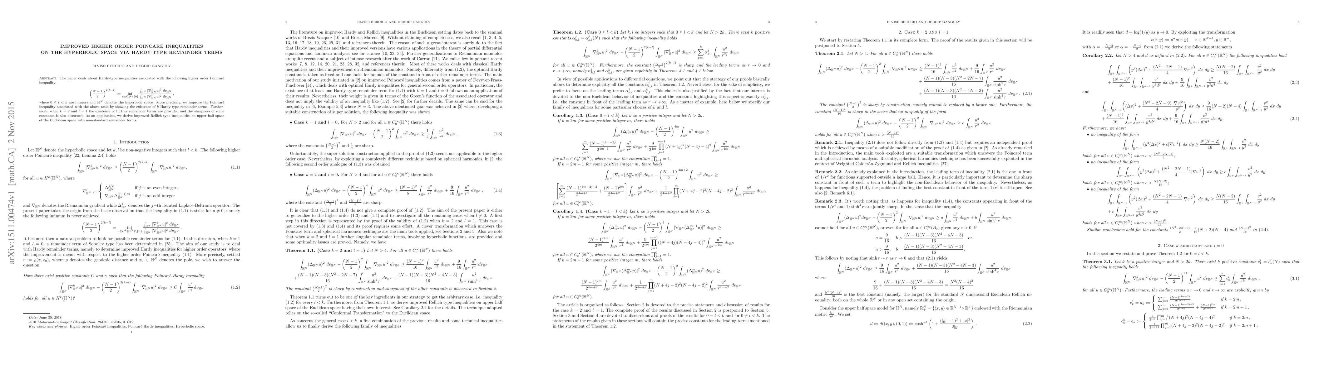 This paper enhances higher order Poincaré inequalities on hyperbolic space by introducing Hardy-type remainder terms. It specifically improves the inequality associated with a ratio involving derivatives, discussing sharpness and deriving improved Rellich type inequalities with non-standard remainder terms in Euclidean space.