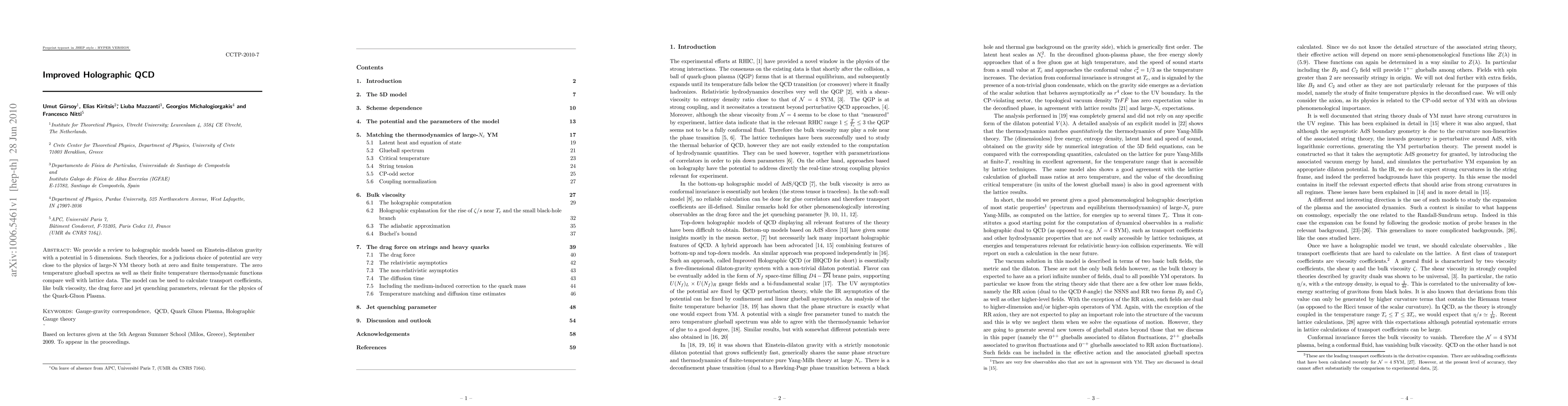 We provide a review to holographic models based on Einstein-dilaton gravity with a potential in 5 dimensions. Such theories, for a judicious choice of potential are very close to the physics of large-N YM theory both at zero and finite temperature. The zero temperature glueball spectra as well as their finite temperature thermodynamic functions compare well with lattice data. The model can be used to calculate transport coefficients, like bulk viscosity, the drag force and jet quenching parameters, relevant for the physics of the Quark-Gluon Plasma.