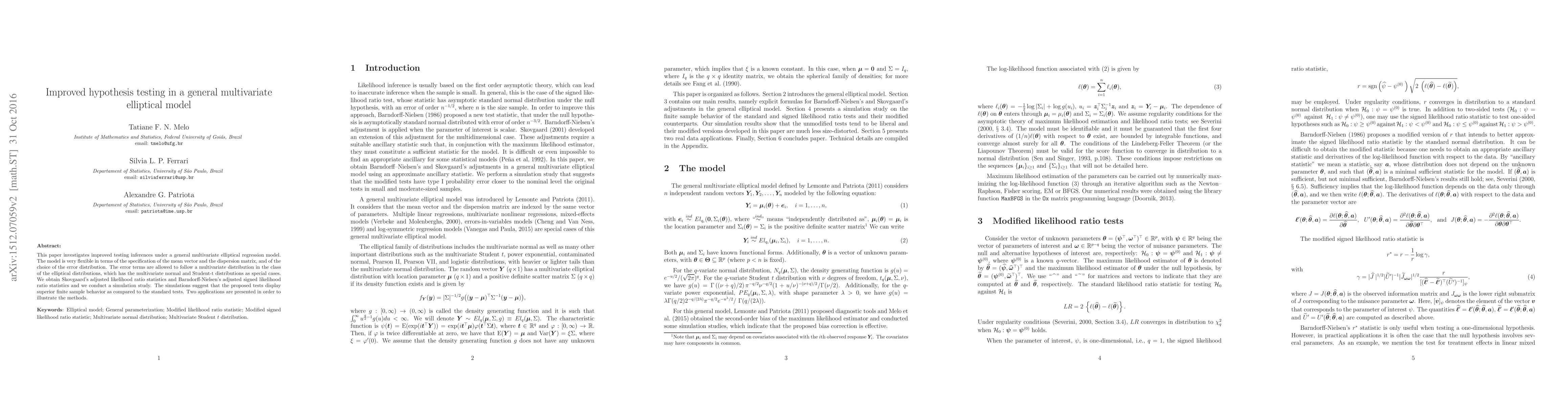 This paper proposes improved hypothesis testing methods in a general multivariate elliptical regression model, utilizing Skovgaard's and Barndorff-Nielsen's adjusted statistics. Simulation results indicate superior performance over standard tests, and two applications demonstrate the practical utility of the proposed methods.