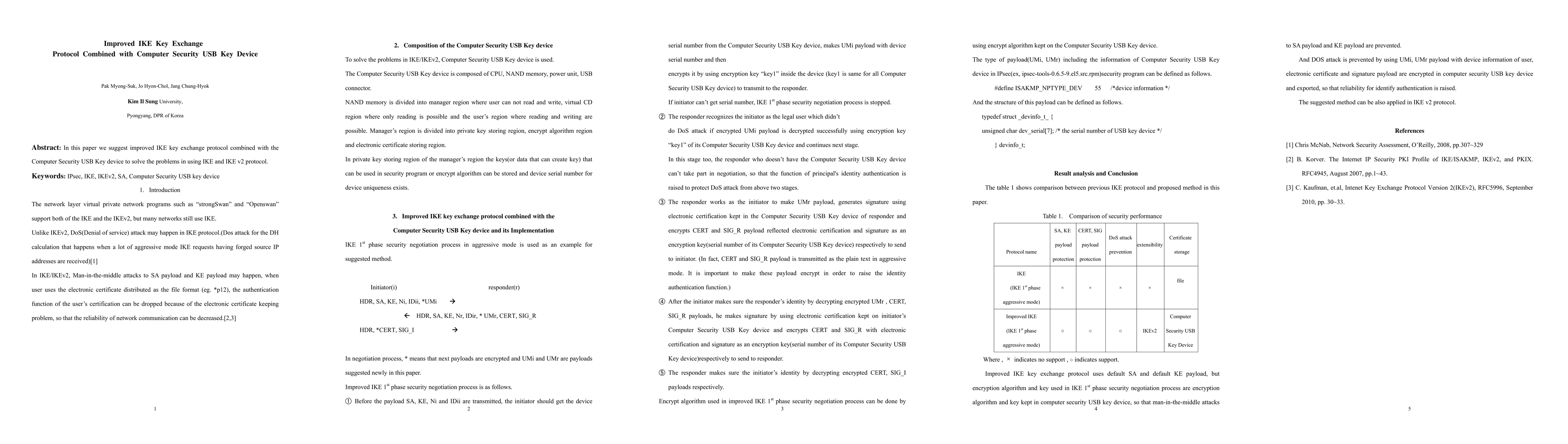 : In this paper we suggest improved IKE key exchange protocol combined with the Computer Security USB Key device to solve the problems in using IKE and IKE v2 protocol.