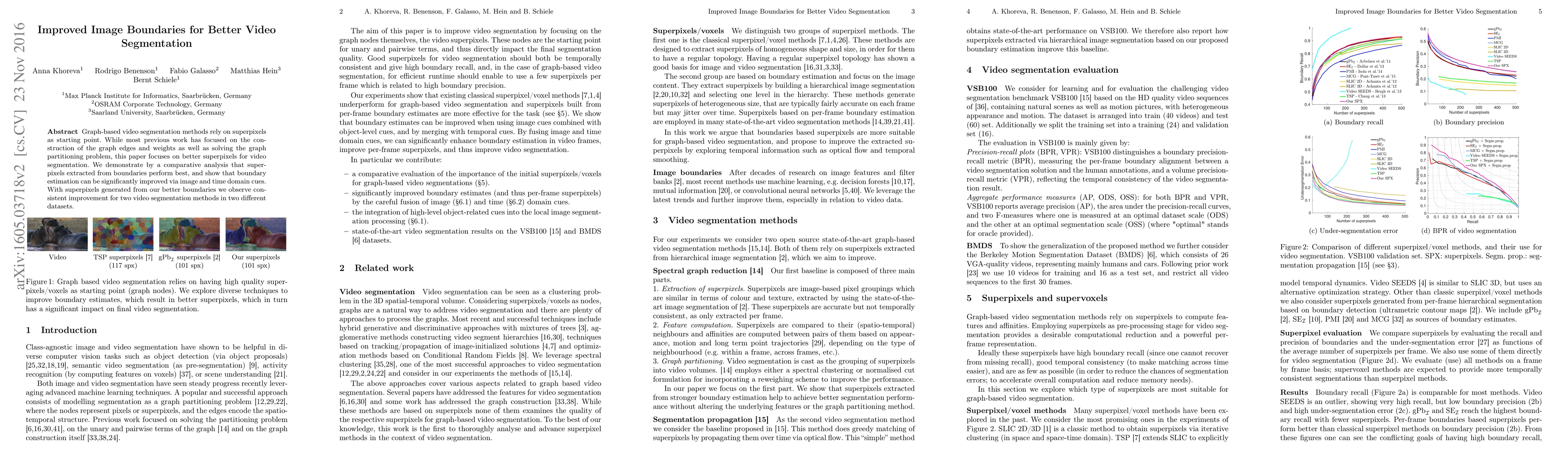 This paper proposes improved superpixels derived from better boundary estimation for video segmentation, showing that such enhancements lead to consistent improvements in two tested segmentation methods across different datasets. The improvement is achieved through the integration of image and time domain cues for boundary estimation.