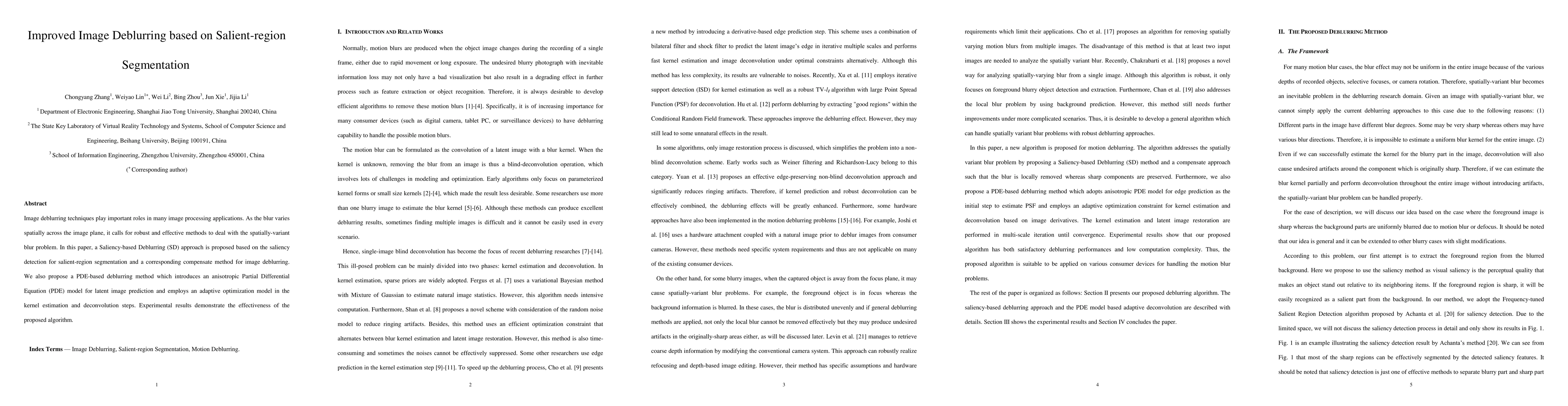 Image deblurring techniques play important roles in many image processing applications. As the blur varies spatially across the image plane, it calls for robust and effective methods to deal with the spatially-variant blur problem. In this paper, a Saliency-based Deblurring (SD) approach is proposed based on the saliency detection for salient-region segmentation and a corresponding compensate method for image deblurring. We also propose a PDE-based deblurring method which introduces an anisotropic Partial Differential Equation (PDE) model for latent image prediction and employs an adaptive optimization model in the kernel estimation and deconvolution steps. Experimental results demonstrate the effectiveness of the proposed algorithm.