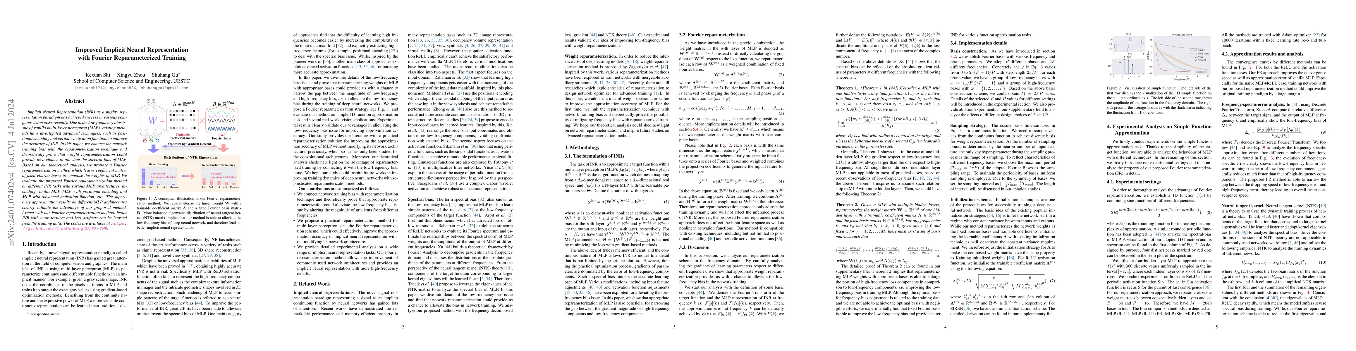 This paper proposes a Fourier reparameterization method to improve Implicit Neural Representation (INR) by addressing the low-frequency bias issue of multi-layer perceptrons (MLPs). The method learns coefficient matrices of fixed Fourier bases to compose MLP weights, demonstrating superior performance across various INR tasks and MLP architectures.