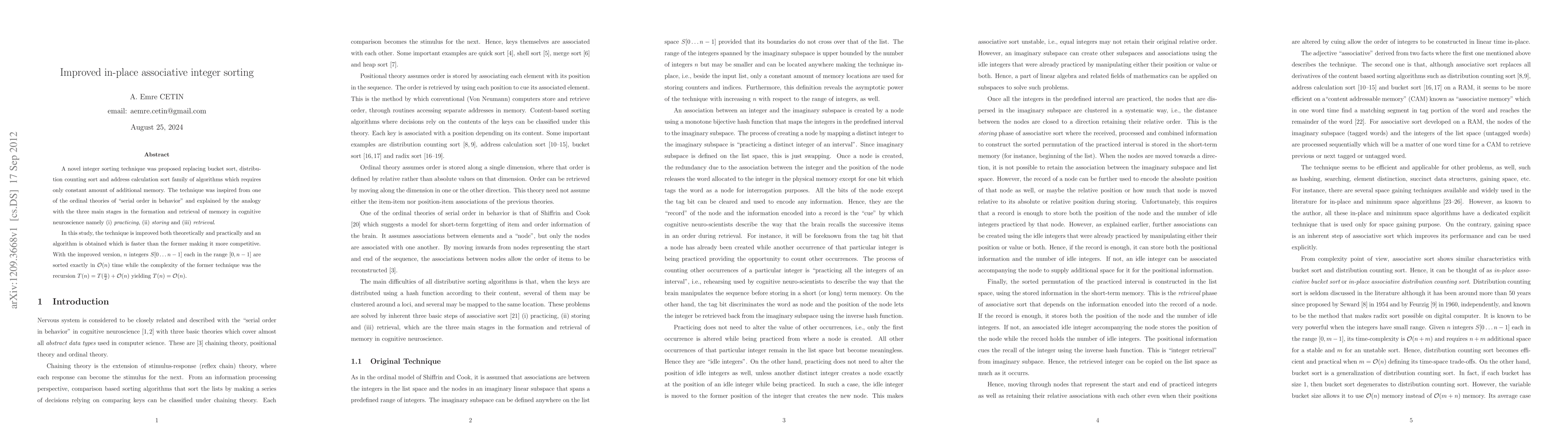 The paper presents an improved in-place associative integer sorting algorithm that efficiently sorts integers in linear time with minimal additional memory usage.