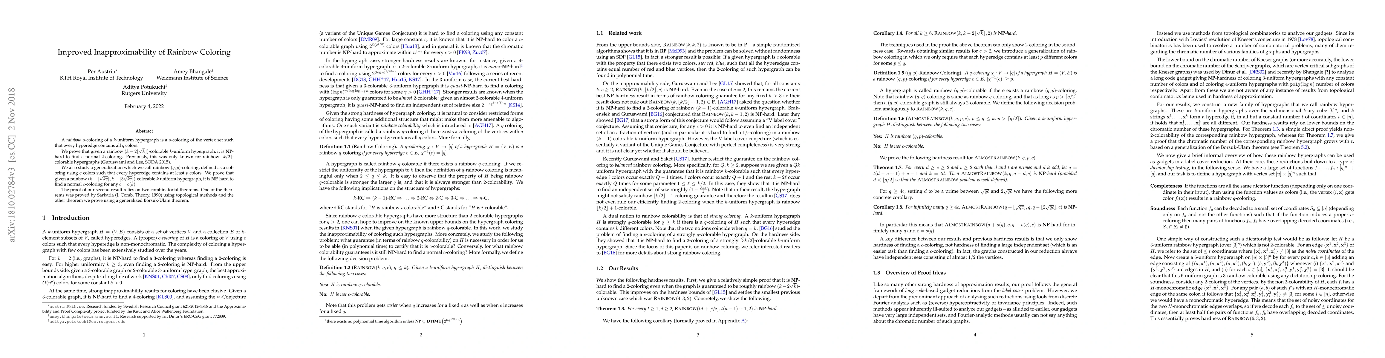 A rainbow $q$-coloring of a $k$-uniform hypergraph is a $q$-coloring of the vertex set such that every hyperedge contains all $q$ colors. We prove that given a rainbow $(k - 2\lfloor \sqrt{k}\rfloor)$-colorable $k$-uniform hypergraph, it is NP-hard to find a normal $2$-coloring. Previously, this was only known for rainbow $\lfloor k/2 \rfloor$-colorable hypergraphs (Guruswami and Lee, SODA 2015). We also study a generalization which we call rainbow $(q, p)$-coloring, defined as a coloring using $q$ colors such that every hyperedge contains at least $p$ colors. We prove that given a rainbow $(k - \lfloor \sqrt{kc} \rfloor, k- \lfloor3\sqrt{kc} \rfloor)$-colorable $k$ uniform hypergraph, it is NP-hard to find a normal $c$-coloring for any $c = o(k)$. The proof of our second result relies on two combinatorial theorems. One of the theorems was proved by Sarkaria (J. Comb. Theory. 1990) using topological methods and the other theorem we prove using a generalized Borsuk-Ulam theorem.
