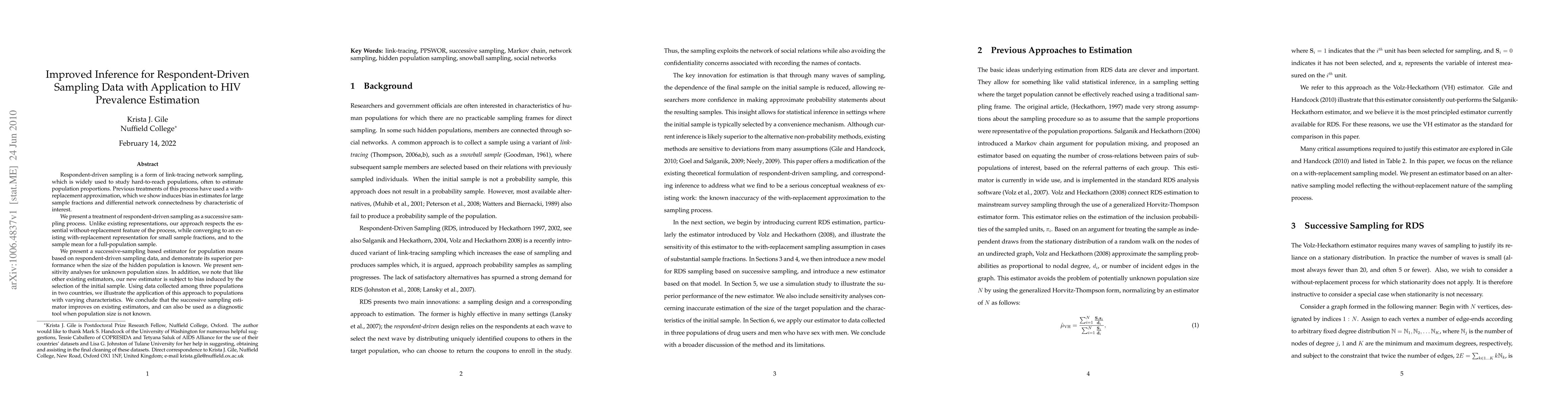 Respondent-driven sampling is a form of link-tracing network sampling, which is widely used to study hard-to-reach populations, often to estimate population proportions. Previous treatments of this process have used a with-replacement approximation, which we show induces bias in estimates for large sample fractions and differential network connectedness by characteristic of interest. We present a treatment of respondent-driven sampling as a successive sampling process. Unlike existing representations, our approach respects the essential without-replacement feature of the process, while converging to an existing with-replacement representation for small sample fractions, and to the sample mean for a full-population sample. We present a successive-sampling based estimator for population means based on respondent-driven sampling data, and demonstrate its superior performance when the size of the hidden population is known. We present sensitivity analyses for unknown population sizes. In addition, we note that like other existing estimators, our new estimator is subject to bias induced by the selection of the initial sample. Using data collected among three populations in two countries, we illustrate the application of this approach to populations with varying characteristics. We conclude that the successive sampling estimator improves on existing estimators, and can also be used as a diagnostic tool when population size is not known.