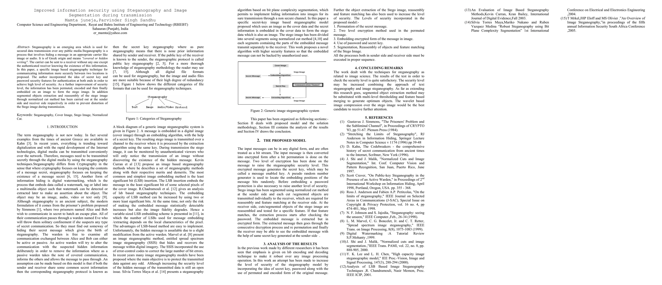Steganography is an emerging area which is used for secured data transmission over any public media.Steganography is a process that involves hiding a message in an appropriate carrier like image or audio. It is of Greek origin and means "covered or hidden writing". The carrier can be sent to a receiver without any one except the authenticated receiver knowing the existence of this information. In this paper, a specific image based steganography technique for communicating information more securely between two locations is proposed. The author incorporated the idea of secret key and password security features for authentication at both ends in order to achieve high level of security. As a further improvement of security level, the information has been permuted, encoded and then finally embedded on an image to form the stego image. In addition segmented objects extraction and reassembly of the stego image through normalized cut method has been carried out at the sender side and receiver side respectively in order to prevent distortion of the Stego image during transmission.