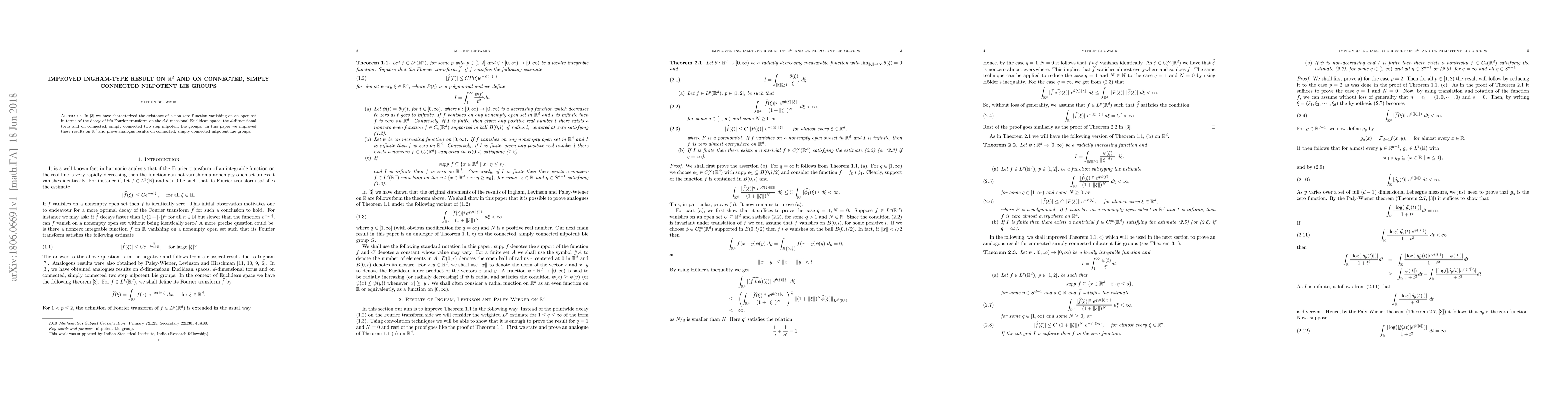 Summary: This paper enhances Ingham-type results regarding the existence of non-zero functions vanishing on open sets, showing improved decay properties of their Fourier transforms on $\mathbb{R}^d$ and connected, simply connected nilpotent Lie groups.
