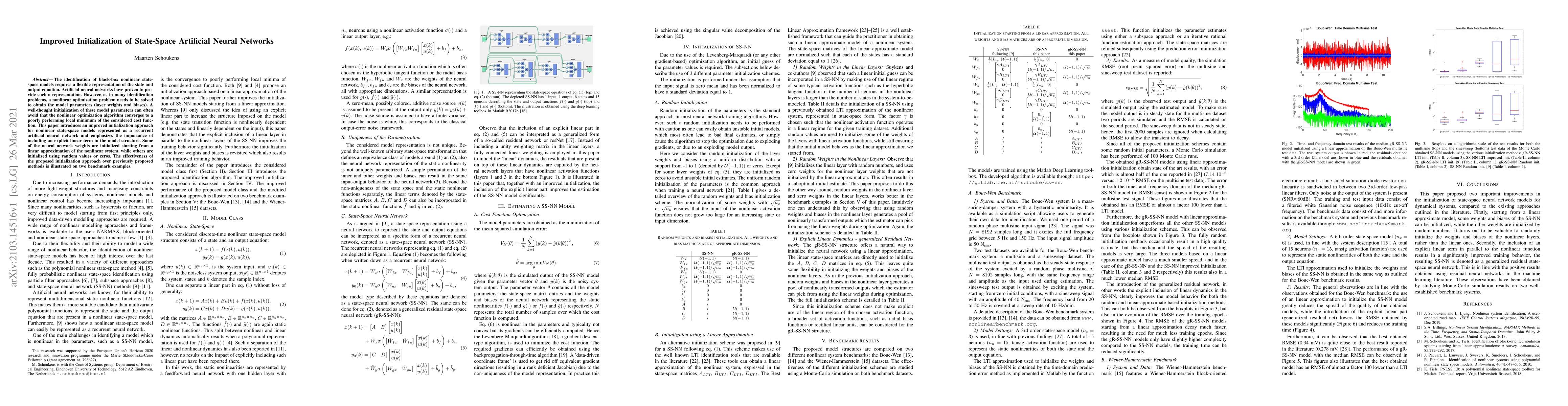 This paper proposes an improved initialization method for artificial neural networks used to identify nonlinear state-space models, emphasizing the inclusion of an explicit linear term in the model structure. The method initializes some weights from a linear approximation of the system and uses random values or zeros for others, demonstrating better performance than previous methods on benchmark examples.