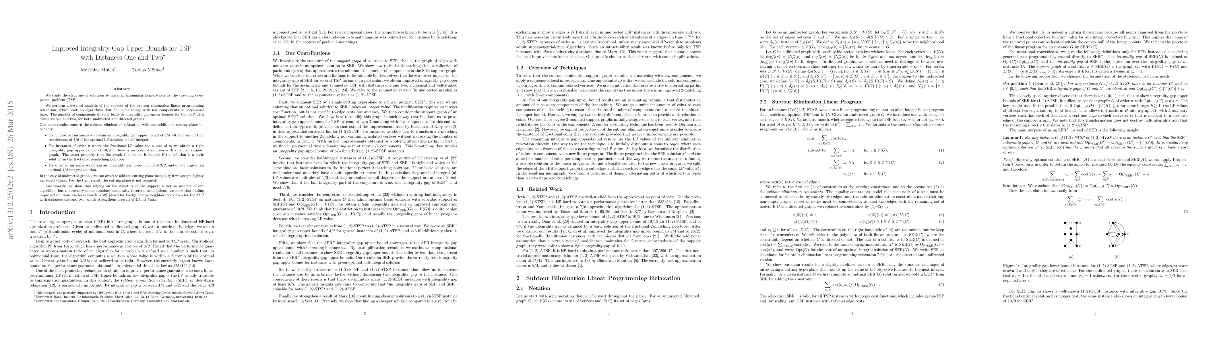 We study the structure of solutions to linear programming formulations for the traveling salesperson problem (TSP). We perform a detailed analysis of the support of the subtour elimination linear programming relaxation, which leads to algorithms that find 2-matchings with few components in polynomial time. The number of components directly leads to integrality gap upper bounds for the TSP with distances one and two, for both undirected and directed graphs. Our main results concern the subtour elimination relaxation with one additional cutting plane inequality: - For undirected instances we obtain an integrality gap upper bound of 5/4 without any further restrictions, of 7/6 if the optimal LP solution is half-integral. - For instances of order n where the fractional LP value has a cost of n, we obtain a tight integrality gap upper bound of 10/9 if there is an optimal solution with subcubic support graph. The latter property that the graph is subcubic is implied if the solution is a basic solution in the fractional 2-matching polytope. - For directed instances we obtain an integrality gap upper bound of 3/2, and of 4/3 if given an optimal 1/2-integral solution. In the case of undirected graphs, we can avoid to add the cutting plane inequality if we accept slightly increased values. For the tight result, the cutting plane is not required. Additionally, we show that relying on the structure of the support is not an artefact of our algorithm, but is necessary under standard complexity-theoretic assumptions: we show that finding improved solutions via local search is W[1]-hard for k-edge change neighborhoods even for the TSP with distances one and two, which strengthens a result of D\'aniel Marx.