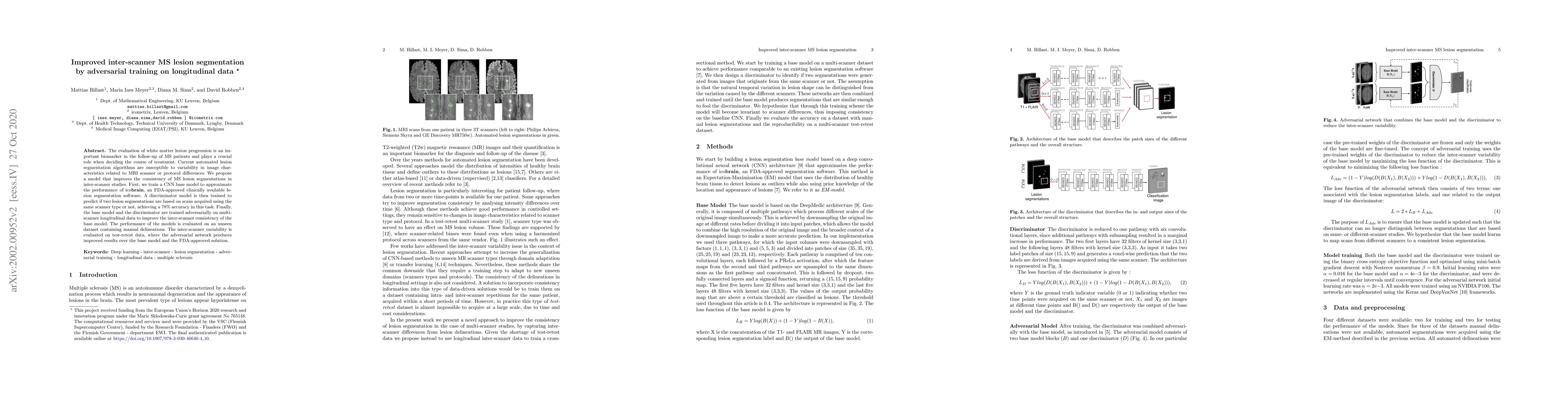 This paper proposes an adversarial training method to enhance the consistency of multiple-scanner MS lesion segmentation in longitudinal studies. The model, trained on multi-scanner data, outperforms both a base CNN model and an FDA-approved solution in reducing inter-scanner variability.