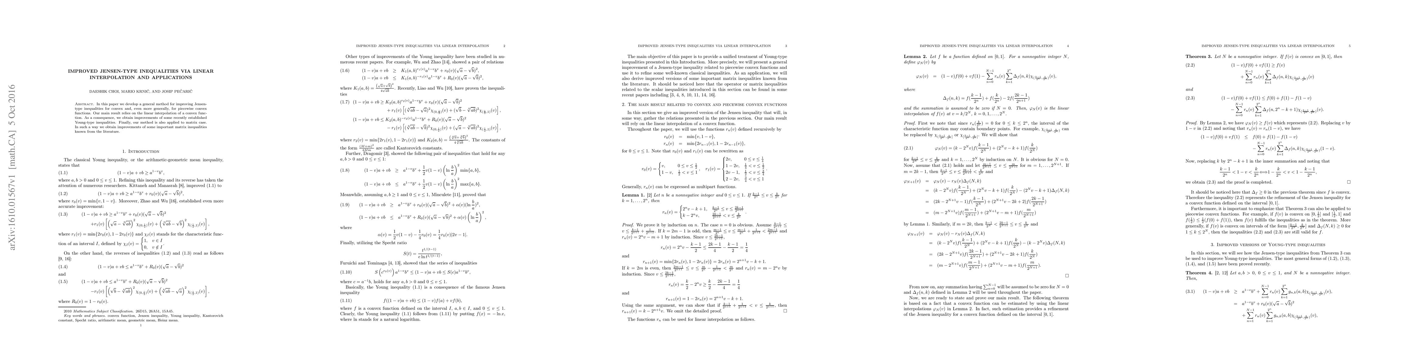 This paper presents a method for enhancing Jensen-type inequalities through linear interpolation of convex functions, leading to improvements in Young-type inequalities and significant advancements in matrix inequalities.