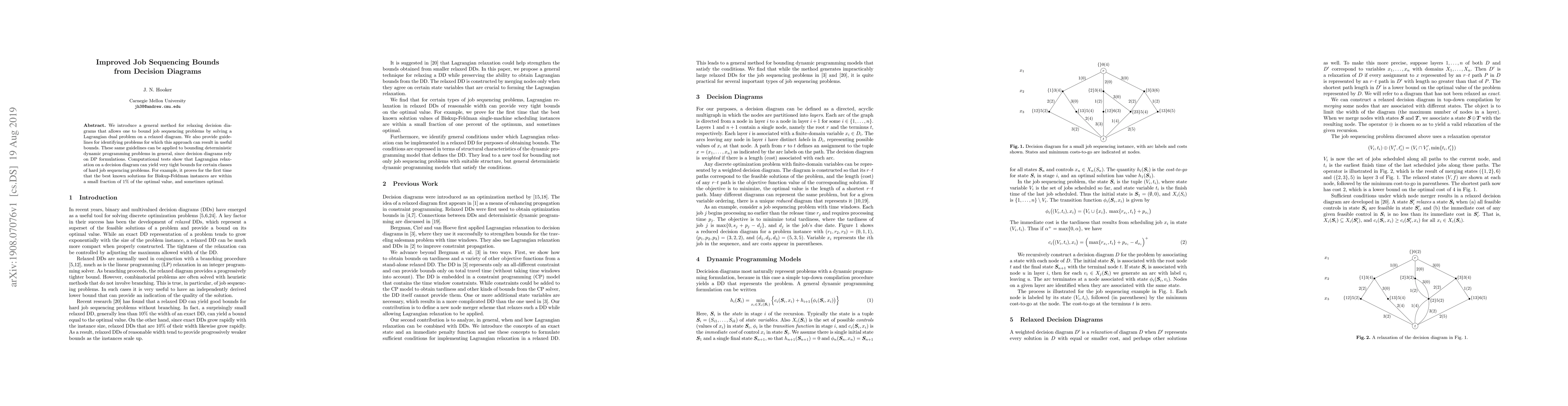 This paper presents a method to improve job sequencing problem bounds using relaxed decision diagrams and Lagrangian dual problems, demonstrating tight bounds for hard instances and showing optimal solutions for specific cases. The approach also extends to bounding deterministic dynamic programming problems.