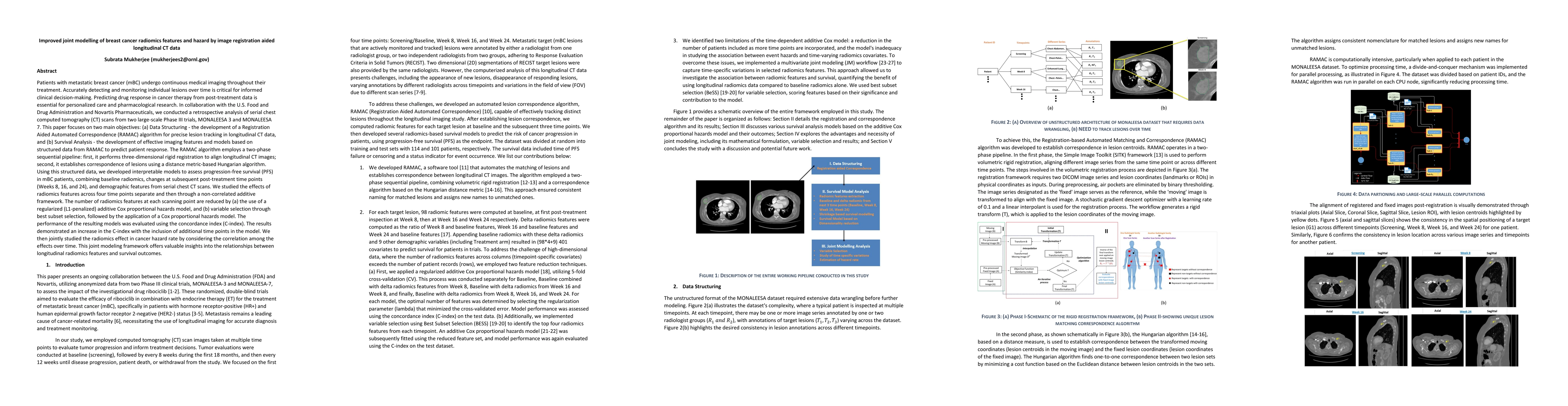 Patients with metastatic breast cancer (mBC) undergo continuous medical imaging during treatment, making accurate lesion detection and monitoring over time critical for clinical decisions. Predicting drug response from post-treatment data is essential for personalized care and pharmacological research. In collaboration with the U.S. Food and Drug Administration and Novartis Pharmaceuticals, we analyzed serial chest CT scans from two large-scale Phase III trials, MONALEESA 3 and MONALEESA 7. This paper has two objectives (a) Data Structuring developing a Registration Aided Automated Correspondence (RAMAC) algorithm for precise lesion tracking in longitudinal CT data, and (b) Survival Analysis creating imaging features and models from RAMAC structured data to predict patient outcomes. The RAMAC algorithm uses a two phase pipeline: three dimensional rigid registration aligns CT images, and a distance metric-based Hungarian algorithm tracks lesion correspondence. Using structured data, we developed interpretable models to assess progression-free survival (PFS) in mBC patients by combining baseline radiomics, post-treatment changes (Weeks 8, 16, 24), and demographic features. Radiomics effects were studied across time points separately and through a non-correlated additive framework. Radiomics features were reduced using (a) a regularized (L1-penalized) additive Cox proportional hazards model, and (b) variable selection via best subset selection. Performance, measured using the concordance index (C-index), improved with additional time points. Joint modeling, considering correlations among radiomics effects over time, provided insights into relationships between longitudinal radiomics and survival outcomes.