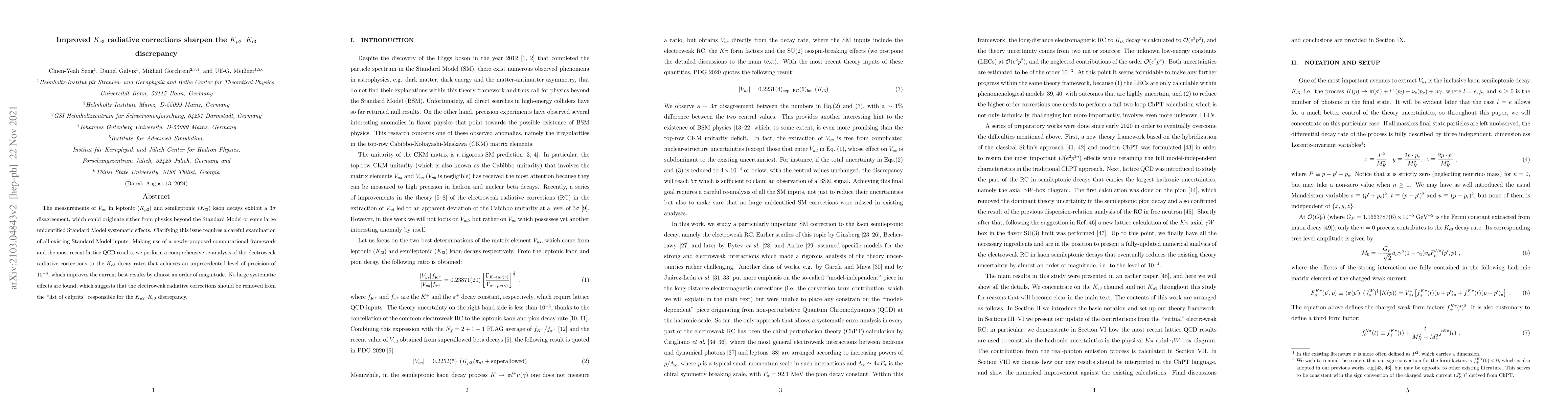 This paper re-evaluates the $K_{\mu 2}$--$K_{l3}$ discrepancy in kaon decay measurements using improved $K_{e3}$ radiative corrections, achieving a precision level of $10^{-4}$. The results suggest that these corrections are unlikely to be the cause of the discrepancy, implying the need to look beyond Standard Model physics or unidentified systematic effects.