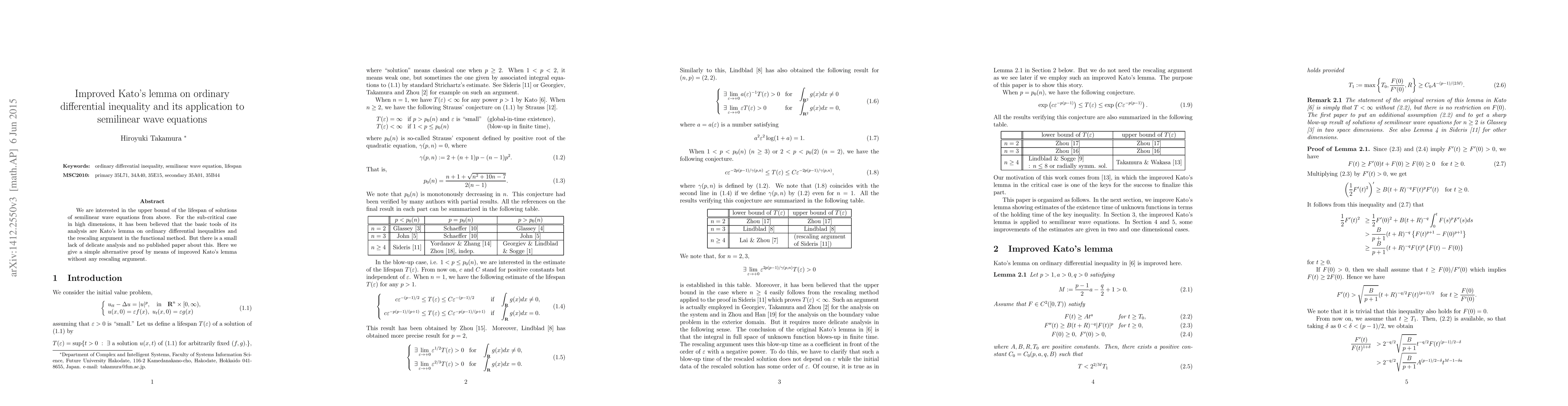 Researchers provide an alternative proof for the lifespan of solutions to semilinear wave equations using improved Kato's lemma, eliminating the need for rescaling arguments in high-dimensional sub-critical cases.