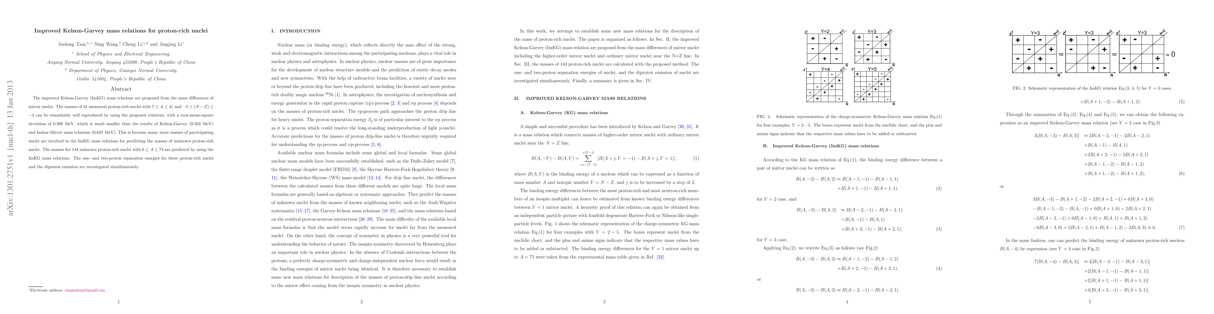 The improved Kelson-Garvey (ImKG) mass relations are proposed from the mass differences of mirror nuclei. The masses of 31 measured proton-rich nuclei with $7\leq A\leq41$ and $-5\leq (N-Z)\leq-3$ can be remarkably well reproduced by using the proposed relations, with a root-mean-square deviation of 0.398 MeV, which is much smaller than the results of Kelson-Garvey (0.502 MeV) and Isobar-Mirror mass relations (0.647 MeV). This is because many more masses of participating nuclei are involved in the ImKG mass relations for predicting the masses of unknown proton-rich nuclei. The masses for 144 unknown proton-rich nuclei with $6\leq A\leq74$ are predicted by using the ImKG mass relations. The one- and two-proton separation energies for these proton-rich nuclei and the diproton emission are investigated simultaneously.