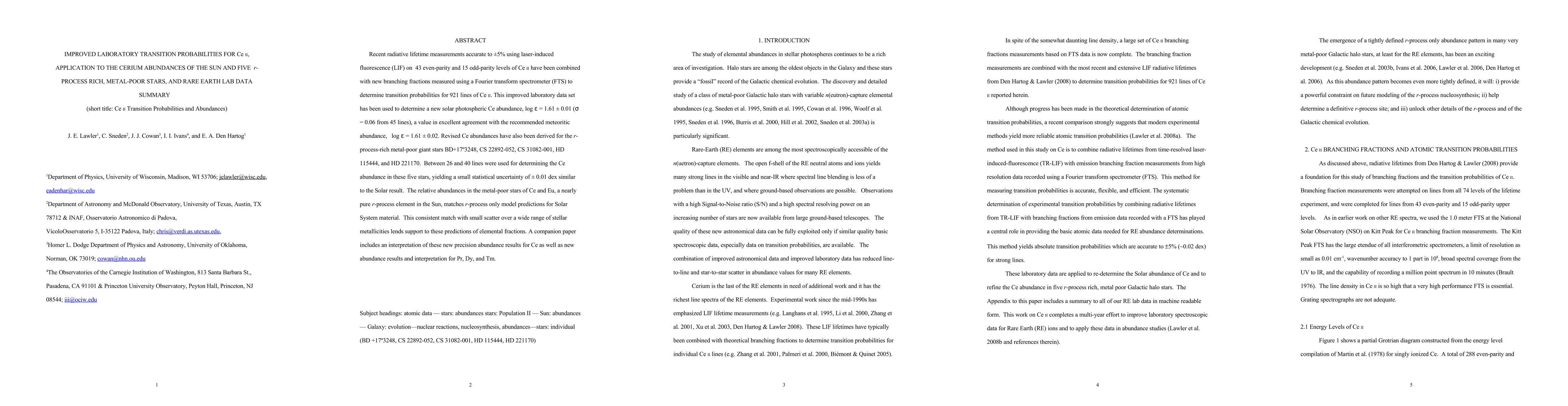 Recent radiative lifetime measurements accurate to +/- 5% using laser-induced fluorescence (LIF) on 43 even-parity and 15 odd-parity levels of Ce II have been combined with new branching fractions measured using a Fourier transform spectrometer (FTS) to determine transition probabilities for 921 lines of Ce II. This improved laboratory data set has been used to determine a new solar photospheric Ce abundance, log epsilon = 1.61 +/- 0.01 (sigma = 0.06 from 45 lines), a value in excellent agreement with the recommended meteoritic abundance, log epsilon = 1.61 +/- 0.02. Revised Ce abundances have also been derived for the r-process-rich metal-poor giant stars BD+17 3248, CS 22892-052, CS 31082-001, HD 115444 and HD 221170. Between 26 and 40 lines were used for determining the Ce abundance in these five stars, yielding a small statistical uncertainty of 0.01 dex similar to the Solar result. The relative abundances in the metal-poor stars of Ce and Eu, a nearly pure r-process element in the Sun, matches r-process only model predictions for Solar System material. This consistent match with small scatter over a wide range of stellar metallicities lends support to these predictions of elemental fractions. A companion paper includes an interpretation of these new precision abundance results for Ce as well as new abundance results and interpretations for Pr, Dy and Tm.