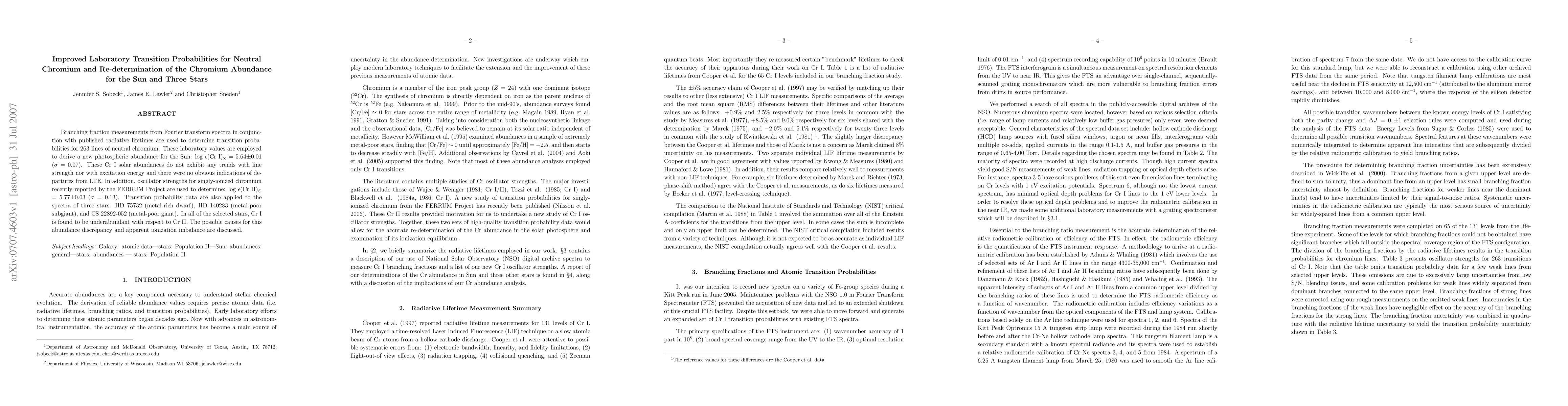 This paper reports improved transition probabilities for 263 neutral chromium lines, leading to a new solar photospheric abundance of log $\epsilon$(Cr I)$_{\odot}$ = 5.64$\pm$0.01, and discusses the underabundance of Cr I relative to Cr II in three stars, suggesting potential ionization imbalance.