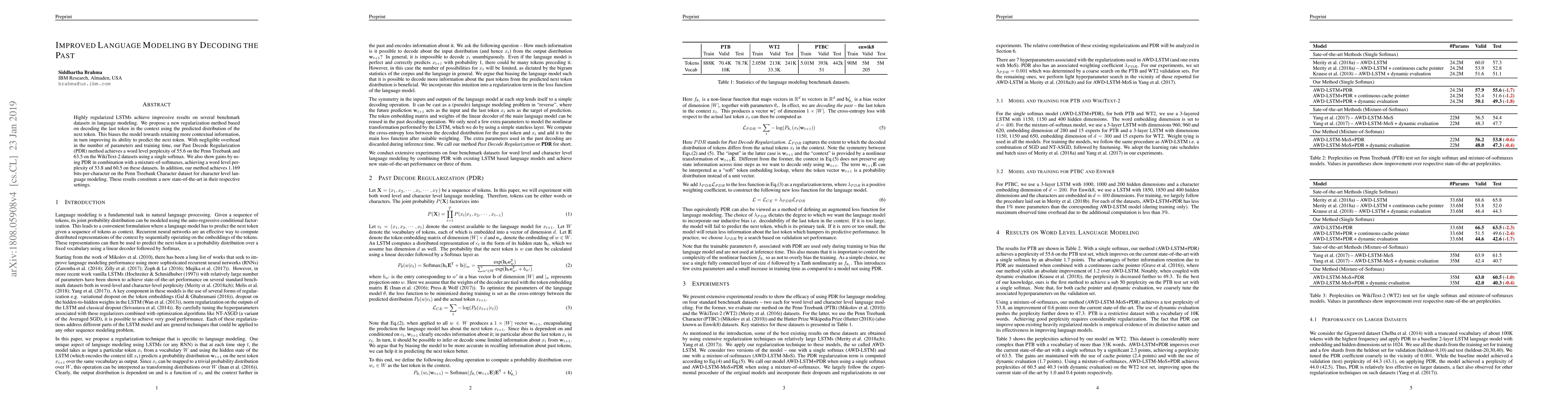 Highly regularized LSTMs achieve impressive results on several benchmark datasets in language modeling. We propose a new regularization method based on decoding the last token in the context using the predicted distribution of the next token. This biases the model towards retaining more contextual information, in turn improving its ability to predict the next token. With negligible overhead in the number of parameters and training time, our Past Decode Regularization (PDR) method achieves a word level perplexity of 55.6 on the Penn Treebank and 63.5 on the WikiText-2 datasets using a single softmax. We also show gains by using PDR in combination with a mixture-of-softmaxes, achieving a word level perplexity of 53.8 and 60.5 on these datasets. In addition, our method achieves 1.169 bits-per-character on the Penn Treebank Character dataset for character level language modeling. These results constitute a new state-of-the-art in their respective settings.
