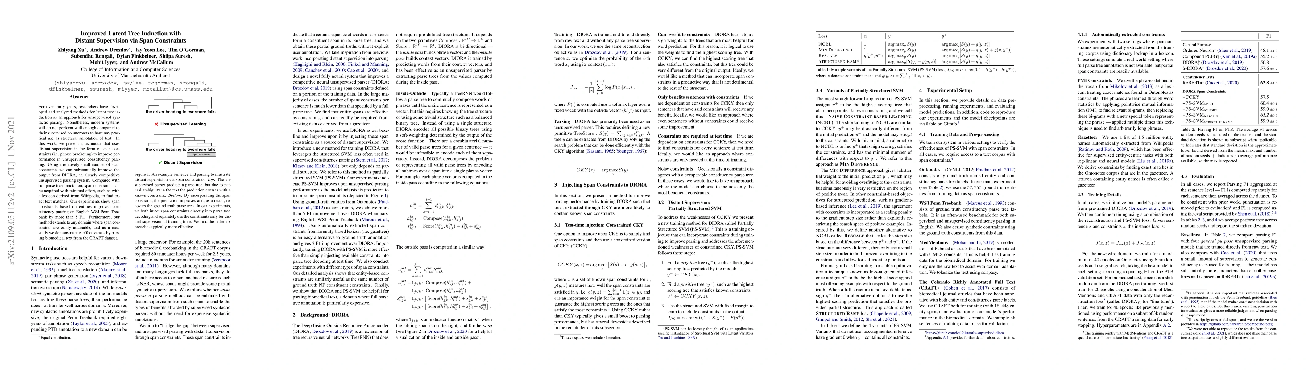 This research introduces a novel technique for enhancing unsupervised syntactic parsing using distant supervision through span constraints. By leveraging minimal effort-acquired span constraints, the method significantly improves the performance of DIORA, an existing unsupervised parsing system, achieving over 5 F1 score improvement on the English WSJ Penn Treebank. The approach is versatile and demonstrated effective in parsing biomedical text from the CRAFT dataset.