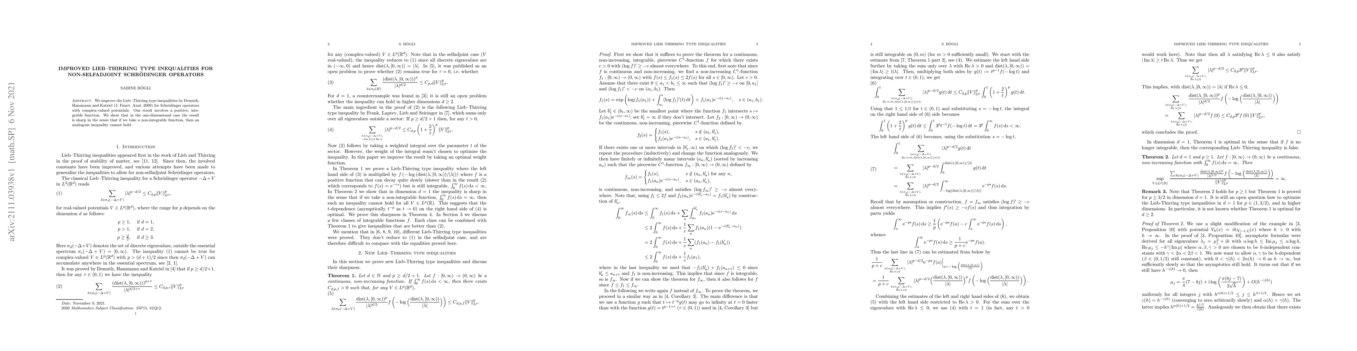 This paper enhances Lieb-Thirring type inequalities for non-selfadjoint Schrödinger operators with complex-valued potentials, using a positive, integrable function. The authors demonstrate that in one dimension, their result is optimal, as non-integrable functions fail to satisfy similar inequalities.