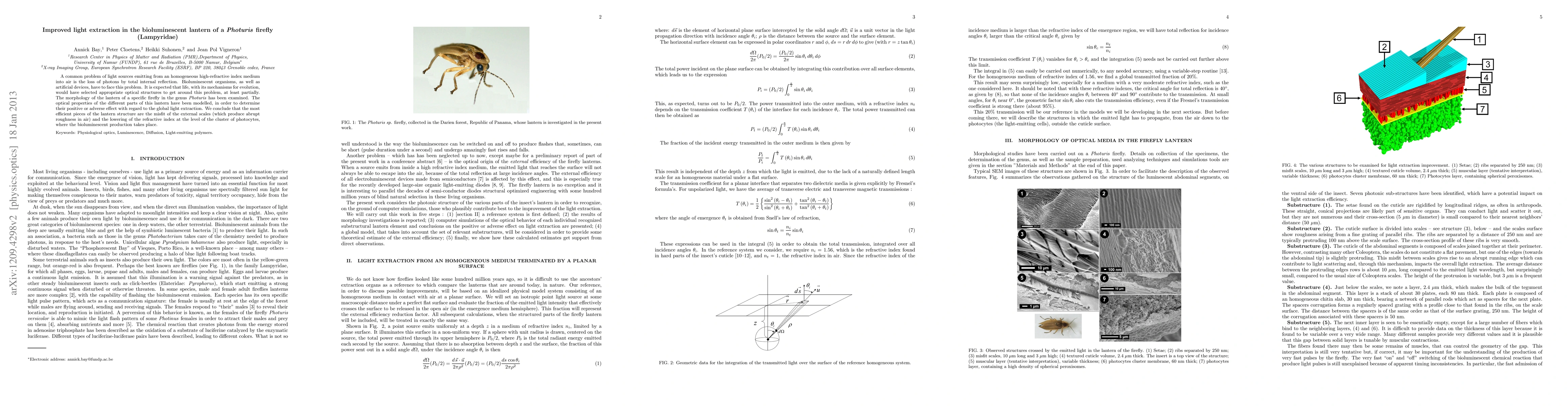 A common problem of light sources emitting from an homogeneous high-refractive index medium into air is the loss of photons by total internal reflection. Bioluminescent organisms, as well as artificial devices, have to face this problem. It is expected that life, with its mechanisms for evolution, would have selected appropriate optical structures to get around this problem, at least partially. The morphology of the lantern of a specific firefly in the genus Photuris has been examined. The optical properties of the different parts of this lantern have been modeled, in order to determine their positive or adverse effect with regard to the global light extraction. We conclude that the most efficient pieces of the lantern structure are the misfit of the external scales (which produce abrupt roughness in air) and the lowering of the refractive index at the level of the cluster of photocytes, where the bioluminescent production takes place.