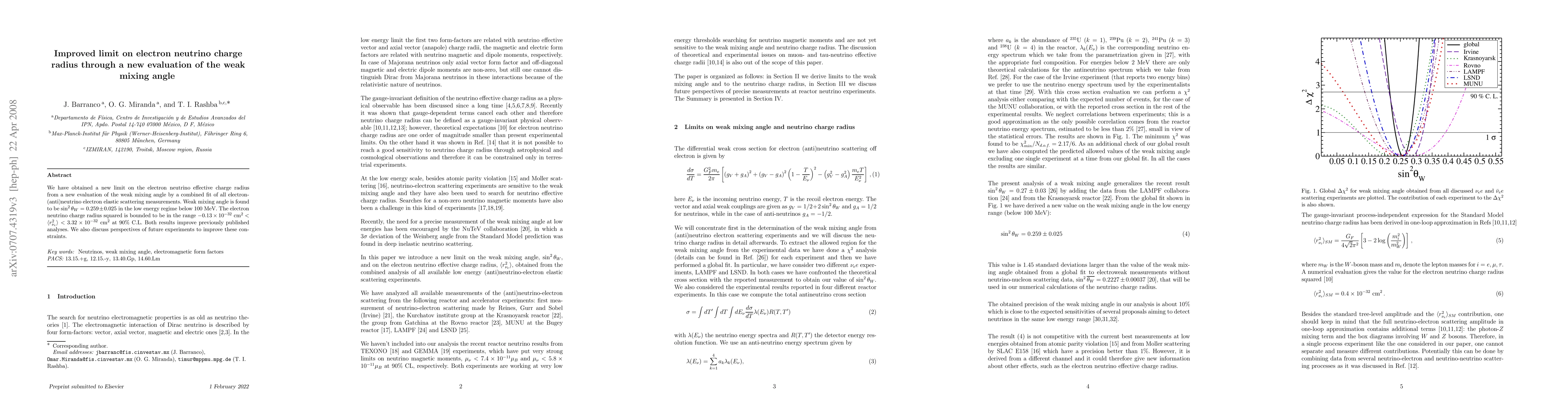 This paper presents a new limit on the electron neutrino charge radius derived from a refined evaluation of the weak mixing angle, achieving a range of -0.13 10^-32 cm^2 < r^2 < 3.32 10^-32 cm^2 at 90% confidence level, improving upon previous analyses. The weak mixing angle is determined to be sin^2 theta_W=0.259 \pm 0.025 in the low energy regime below 100 MeV.