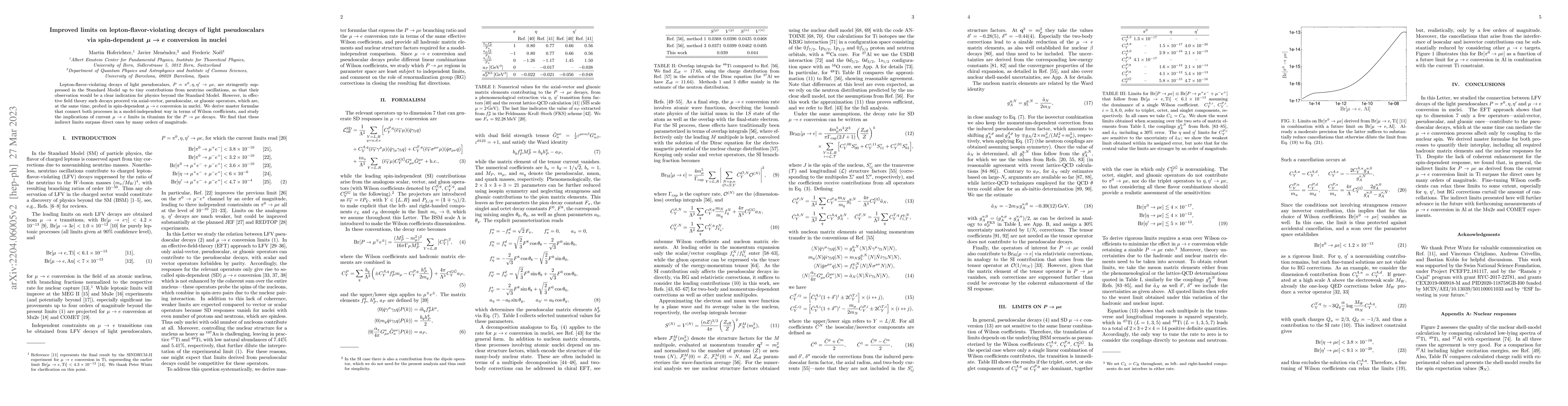 This paper investigates lepton-flavor-violating decays of light pseudoscalars via spin-dependent $\mu\to e$ conversion in nuclei, deriving model-independent connections between these processes. It finds that current limits on $\mu\to e$ conversion in titanium provide much stronger constraints on $P\to\mu e$ decays than direct measurements.
