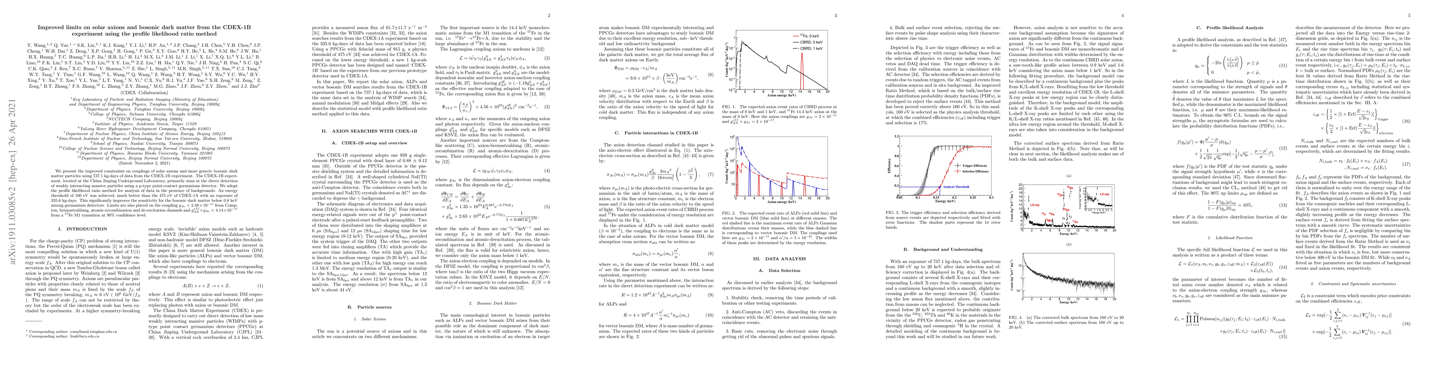 The CDEX-1B experiment significantly improves constraints on solar axions and bosonic dark matter using the profile likelihood ratio method, achieving a 160 eV energy threshold and enhancing sensitivity to dark matter below 0.8 keV. The study places limits on coupling constants, including $g_{Ae} < 2.48 \times 10^{-11}$ and $g^{eff}_{AN} \times g_{Ae} < 4.14 \times 10^{-17}$.