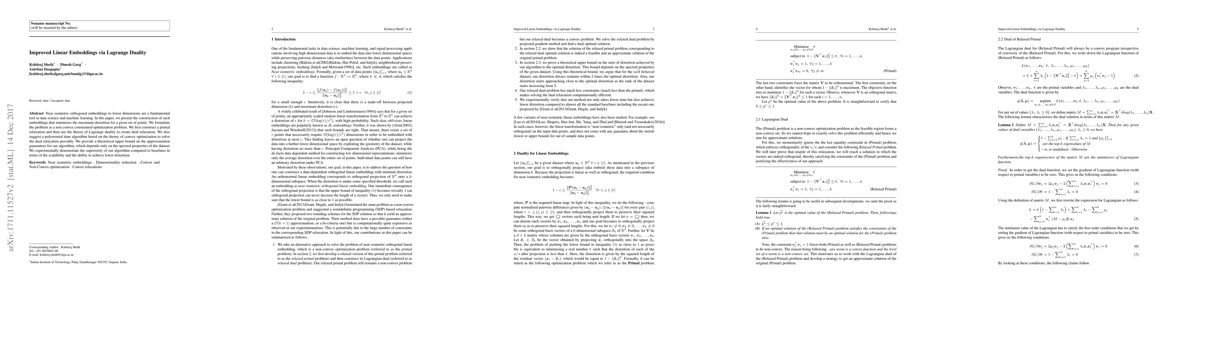 The paper presents a novel method using Lagrange duality to construct near-isometric orthogonal linear embeddings, formulating the problem as a non-convex constrained optimization problem and solving it via a polynomial time algorithm based on convex optimization.