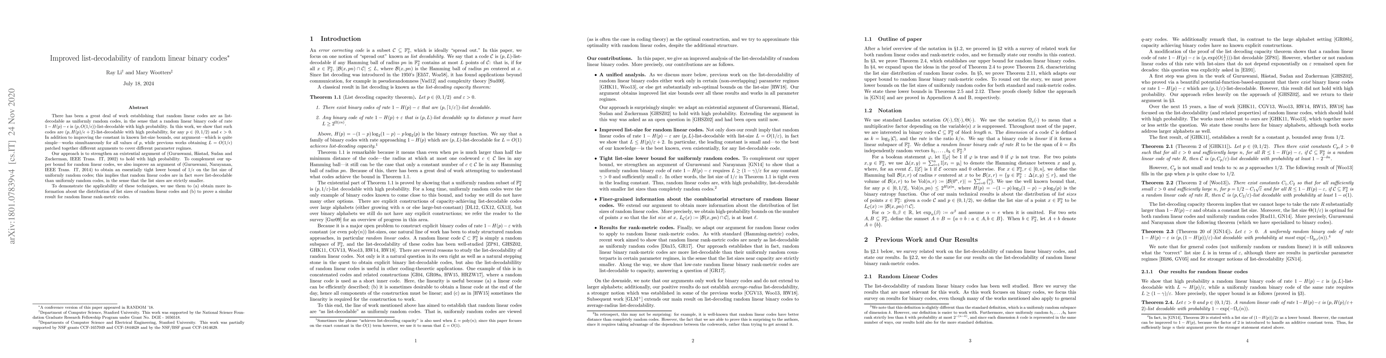 This paper improves the list-decodability of random linear binary codes, showing they are $(p, H(p)/\epsilon + 2)$-list-decodable with high probability, enhancing known bounds and working uniformly across all values of $p$. It also establishes a tighter lower bound for uniformly random codes, indicating that random linear codes outperform them in terms of list size.