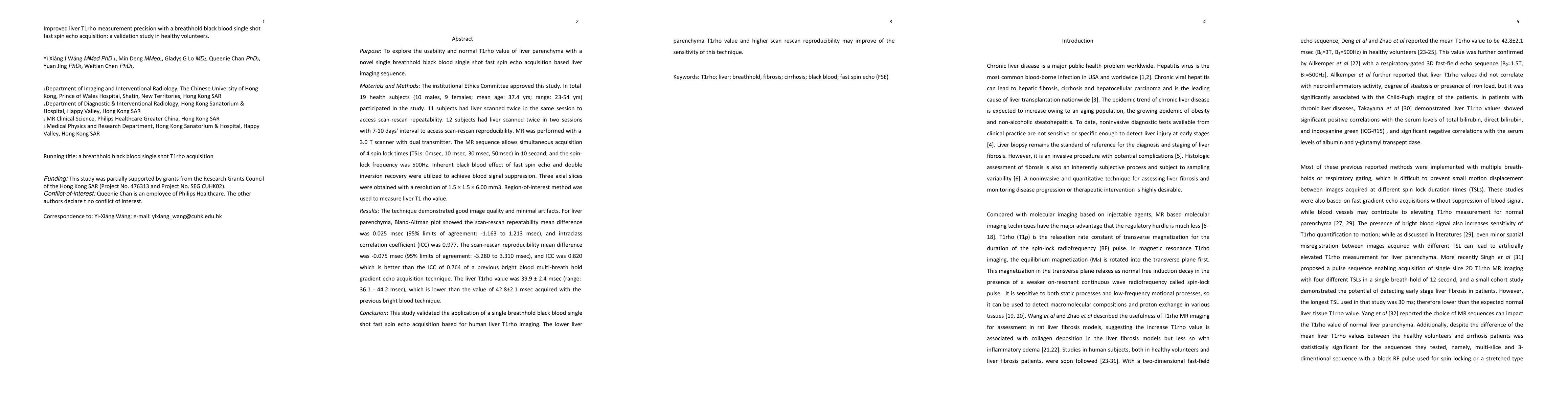 Purpose: To explore the usability and normal T1rho value of liver parenchyma with a novel single breathhold black blood single shot fast spin echo acquisition based liver imaging sequence. Materials and Methods: In total 19 health subjects (10 males, 9 females; mean age: 37.4 yrs; range: 23-54 yrs) participated in the study. 11 subjects had liver scanned twice in the same session to access scan-rescan repeatability. 12 subjects had liver scanned twice in two sessions with 7-10 days' interval to access scan-rescan reproducibility. MR was performed with a 3.0 T scanner with dual transmitter. The MR sequence allows simultaneous acquisition of 4 spin lock times (TSLs: 0ms, 10 ms, 30 ms, 50ms) in 10 second. Inherent black blood effect of fast spin echo and double inversion recovery were utilized to achieve blood signal suppression. Results: The technique demonstrated good image quality and minimal artifacts. For liver parenchyma, Bland-Altman plot showed the scan-rescan repeatability mean difference was 0.025 ms (95% limits of agreement: -1.163 to 1.213 ms), and intraclass correlation coefficient (ICC) was 0.977. The scan-rescan reproducibility mean difference was -0.075 ms (95% limits of agreement: -3.280 to 3.310 ms), and ICC was 0.820 which is better than the ICC of 0.764 of a previous bright blood multi-breath hold gradient echo acquisition technique. The liver T1rho value was 39.9 +/- 2.4 ms (range: 36.1 - 44.2 ms), which is lower than the value of 42.8=/-2.1 ms acquired with the previous bright blood technique. Conclusion: This study validated the application of a single breathhold black blood single shot fast spin echo acquisition based for human liver T1rho imaging. The lower liver parenchyma T1rho value and higher scan rescan reproducibility may improve of the sensitivity of this technique.
