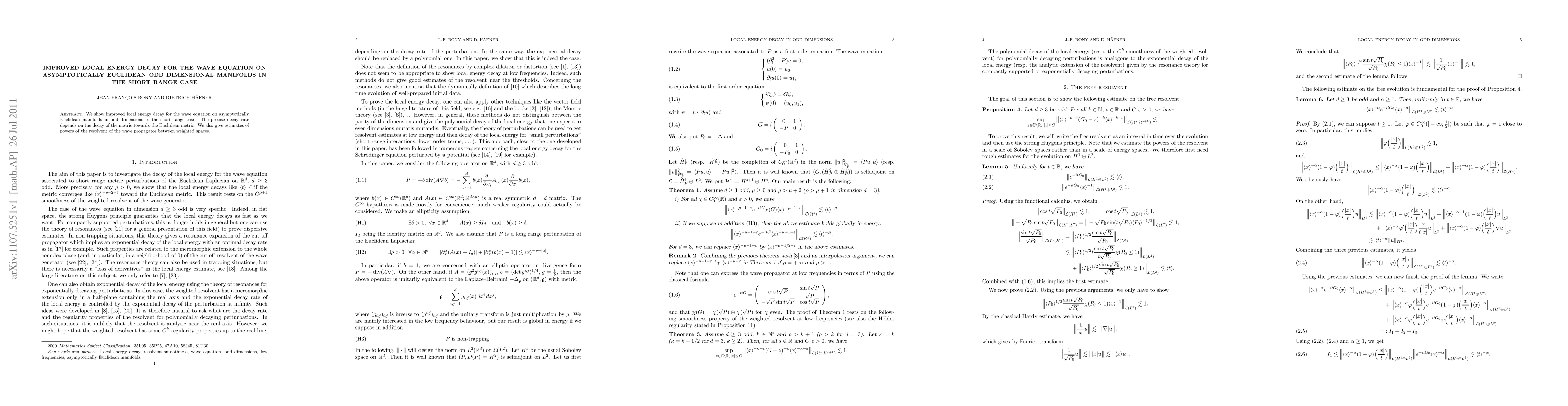 This paper demonstrates enhanced local energy decay for the wave equation on asymptotically Euclidean odd-dimensional manifolds in the short range scenario, with decay rate contingent on the metric's convergence towards Euclidean. It also provides estimates for powers of the wave propagator's resolvent between weighted spaces.
