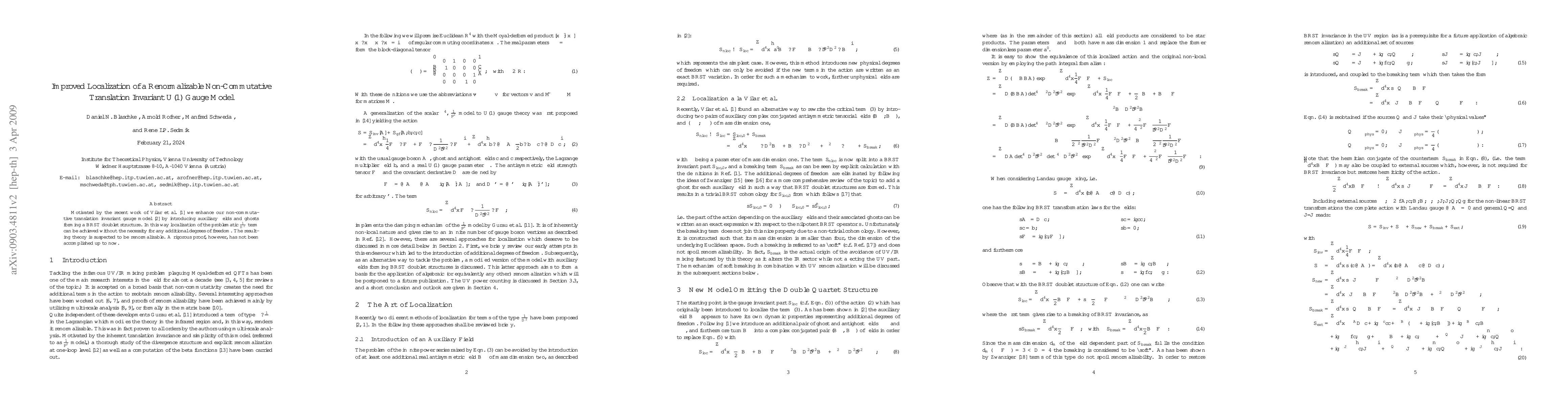 The paper enhances a non-commutative translation invariant U(1) gauge model using auxiliary fields and BRST doublet ghosts to localize a problematic 1/D^2 term without adding extra degrees of freedom, potentially leading to a renormalizable theory. A formal proof of renormalizability remains pending.