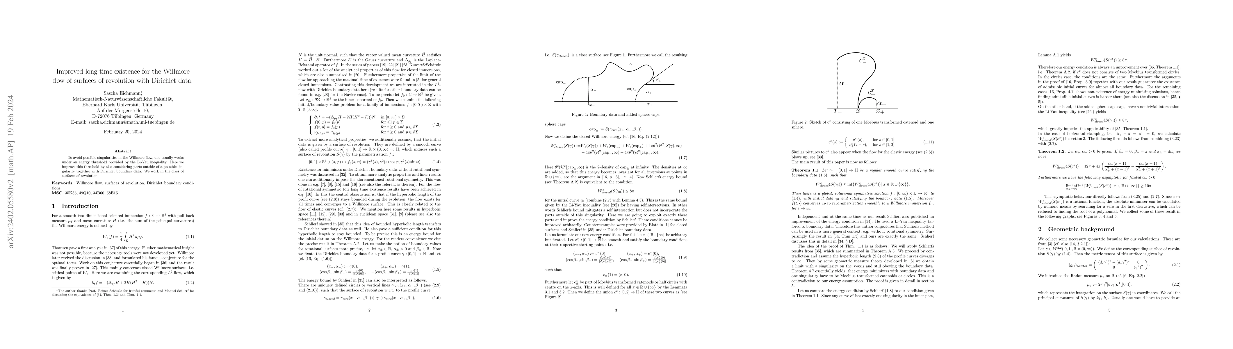 Summary: This paper enhances the long-time existence of the Willmore flow for surfaces of revolution by improving the energy threshold, incorporating Dirichlet boundary data and regions outside potential singularities, thereby avoiding possible singularities in the flow.