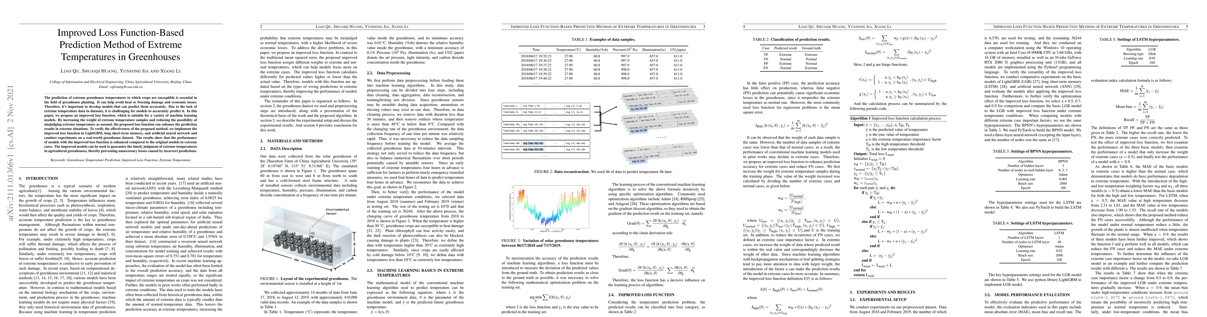 The paper proposes an improved loss function to enhance the prediction of extreme temperatures in greenhouses by assigning different weights to extreme and normal temperatures. This function is applied to LightGBM, LSTM, and artificial neural networks using a real-world greenhouse dataset.
