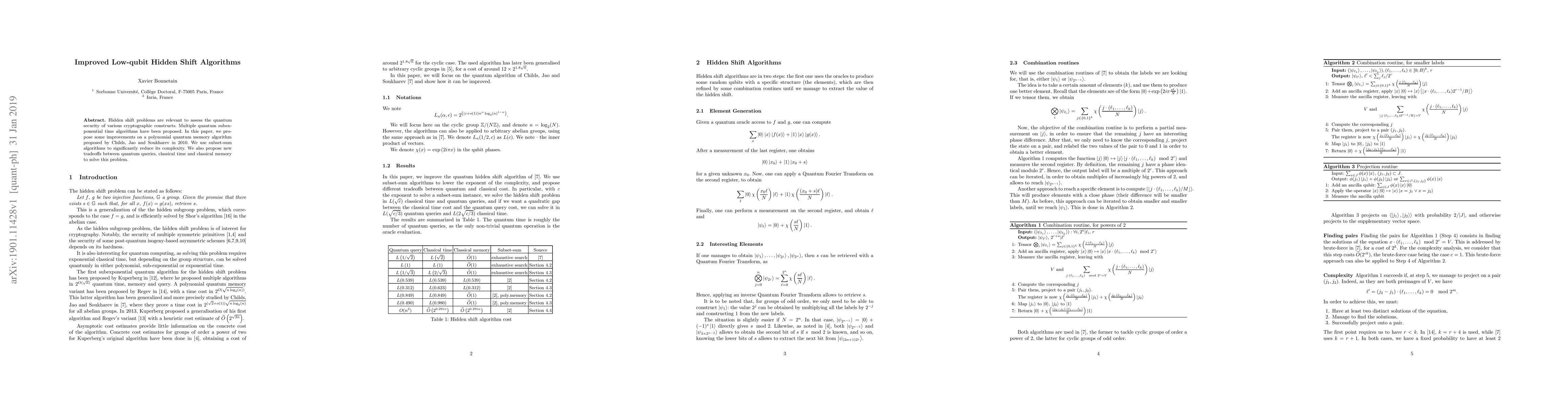This paper presents enhancements to a polynomial quantum memory algorithm for hidden shift problems, utilizing subset-sum algorithms to reduce complexity and introducing new tradeoffs between quantum queries, classical time, and memory.