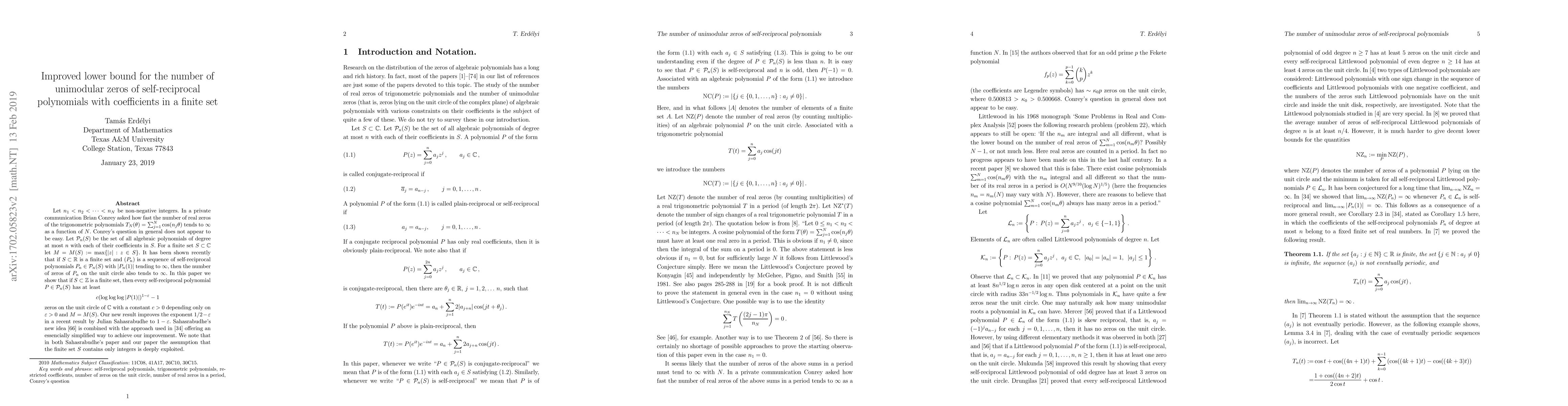 Let $n_1 < n_2 < \cdots < n_N$ be non-negative integers. In a private communication Brian Conrey asked how fast the number of real zeros of the trigonometric polynomials $T_N(\theta) = \sum_{j=1}^N {\cos (n_j\theta)}$ tends to $\infty$ as a function of $N$. Conrey's question in general does not appear to be easy.Let ${\mathcal P}_n(S)$ be the set of all algebraic polynomials of degree at most $n$ with each of their coefficients in $S$. For a finite set $S \subset {\mathbb C}$ let $M = M(S) := \max\{|z|: z \in S\}$. It has been shown recently that if $S \subset {\mathbb R}$ is a finite set and $(P_n)$ is a sequence of self-reciprocal polynomials $P_n \in {\mathcal P}_n(S)$ with $|P_n(1)|$ tending to $\infty$, then the number of zeros of $P_n$ on the unit circle also tends to $\infty$. In this paper we show that if $S \subset {\mathbb Z}$ is a finite set, then every self-reciprocal polynomial $P \in {\mathcal P}_n(S)$ has at least $$c(\log\log\log|P(1)|)^{1-\varepsilon}-1$$ zeros on the unit circle of ${\mathbb C}$ with a constant $c > 0$ depending only on $\varepsilon > 0$ and$M = M(S)$. Our new result improves the exponent $1/2 - \varepsilon$ in a recent result by Julian Sahasrabudhe to $1 - \varepsilon$. Sahasrabudhe's new idea [66] is combined with the approach used in [34] offering an essencially simplified way to achieve our improvement. We note that in both Sahasrabudhe's paper and our paper the assumption that the finite set $S$ contains only integers is deeply exploited.