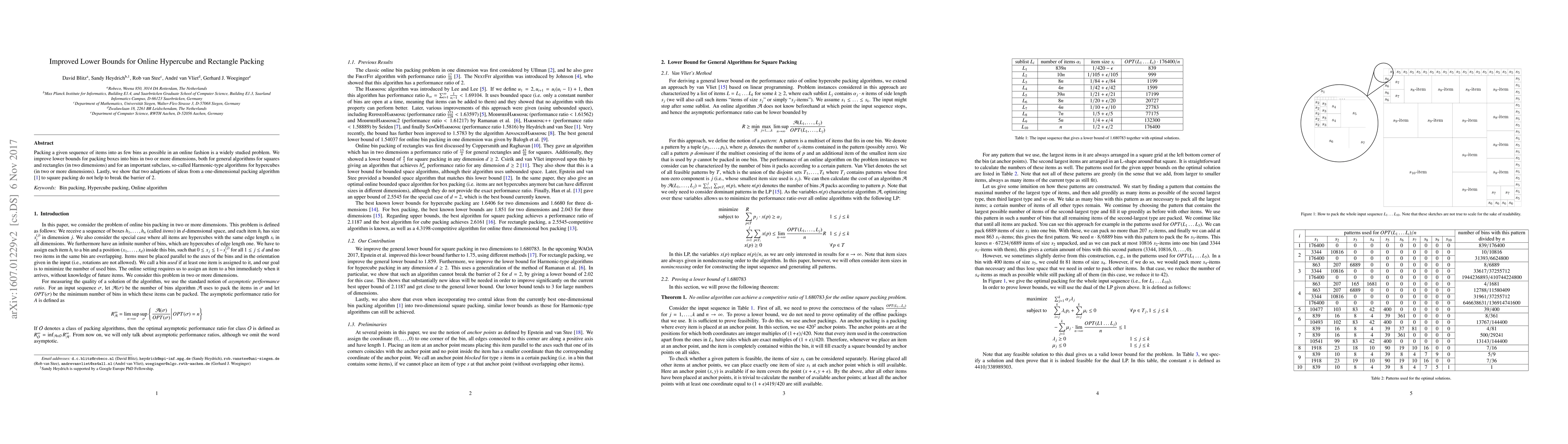 This paper enhances lower bounds for online packing algorithms for rectangles and hypercubes, demonstrating improved limits for both general and Harmonic-type algorithms. It also concludes that adaptations of one-dimensional packing strategies for square packing do not surpass the established 2-bin threshold.