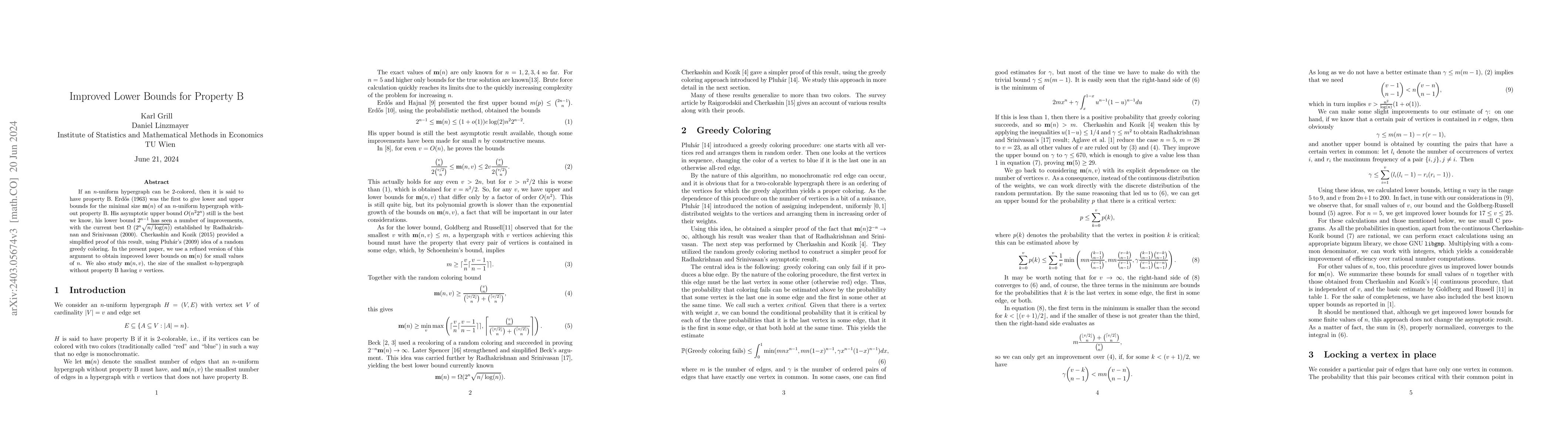 The work builds upon Cherkashin and Kozik's (2014) proof, using a more refined version of the random greedy coloring argument and Pluhár's (2009) idea to establish better lower bounds for m(n) and m(n, v) for small values of n and v.