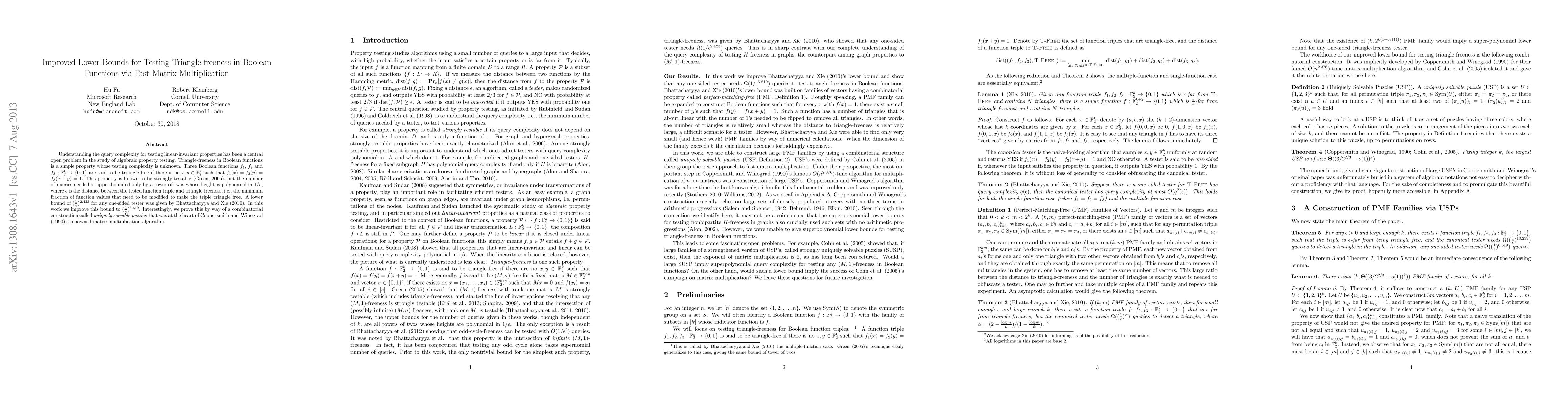 Understanding the query complexity for testing linear-invariant properties has been a central open problem in the study of algebraic property testing. Triangle-freeness in Boolean functions is a simple property whose testing complexity is unknown. Three Boolean functions $f_1$, $f_2$ and $f_3: \mathbb{F}_2^k \to \{0, 1\}$ are said to be triangle free if there is no $x, y \in \mathbb{F}_2^k$ such that $f_1(x) = f_2(y) = f_3(x + y) = 1$. This property is known to be strongly testable (Green 2005), but the number of queries needed is upper-bounded only by a tower of twos whose height is polynomial in $1 / \epsislon$, where $\epsislon$ is the distance between the tested function triple and triangle-freeness, i.e., the minimum fraction of function values that need to be modified to make the triple triangle free. A lower bound of $(1 / \epsilon)^{2.423}$ for any one-sided tester was given by Bhattacharyya and Xie (2010). In this work we improve this bound to $(1 / \epsilon)^{6.619}$. Interestingly, we prove this by way of a combinatorial construction called \emph{uniquely solvable puzzles} that was at the heart of Coppersmith and Winograd's renowned matrix multiplication algorithm.
