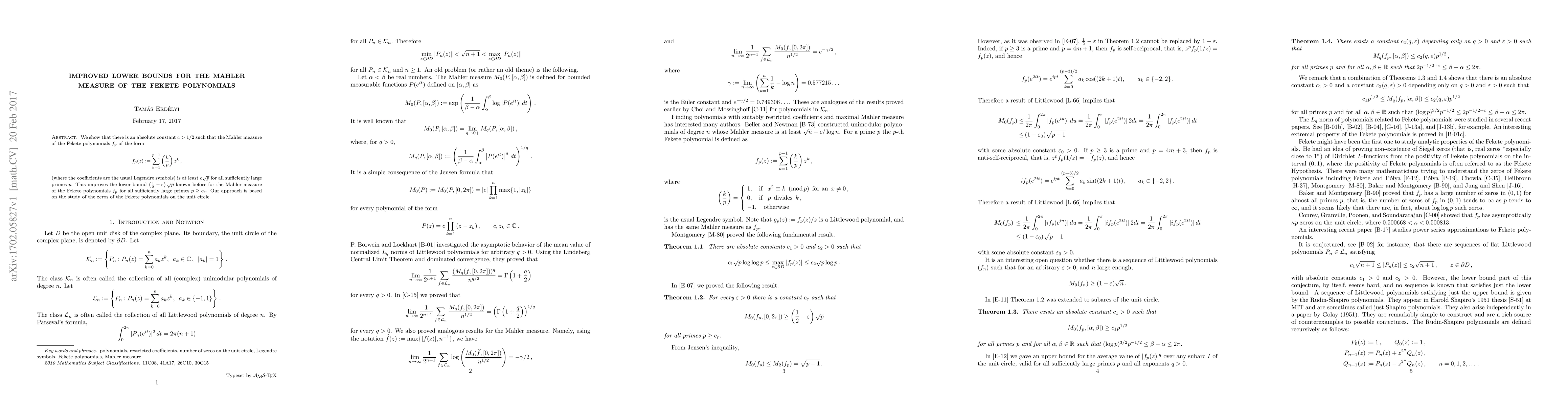 This paper establishes an improved absolute lower bound of $c\sqrt{p}$ for the Mahler measure of the Fekete polynomials for sufficiently large primes, surpassing the previous bound of $\left(\frac 12 - \varepsilon\right)\sqrt{p}$. The improvement is achieved through an analysis of the zeros of these polynomials on the unit circle.