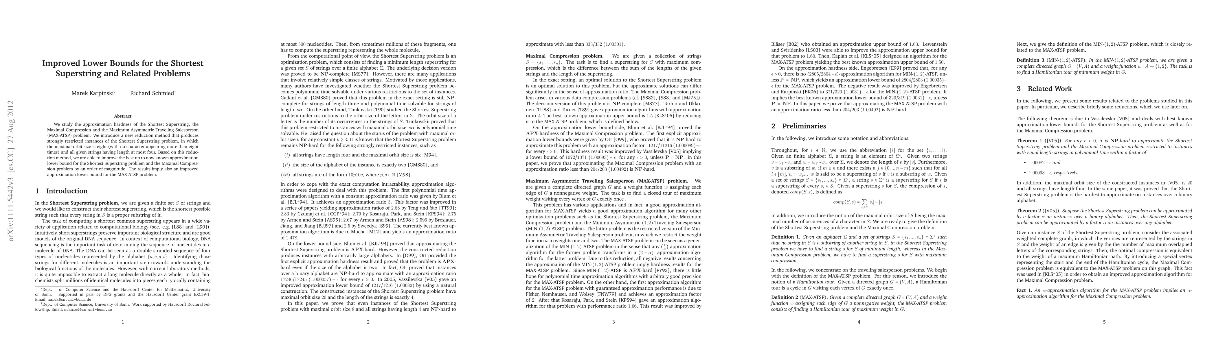 We study the approximation hardness of the Shortest Superstring, the Maximal Compression and the Maximum Asymmetric Traveling Salesperson (MAX-ATSP) problem. We introduce a new reduction method that produces strongly restricted instances of the Shortest Superstring problem, in which the maximal orbit size is eight (with no character appearing more than eight times) and all given strings having length four. Based on this reduction method, we are able to improve the best up to now known approximation lower bound for the Shortest Superstring problem and the Maximal Compression problem by an order of magnitude. The results imply also an improved approximation lower bound for the MAX-ATSP problem.