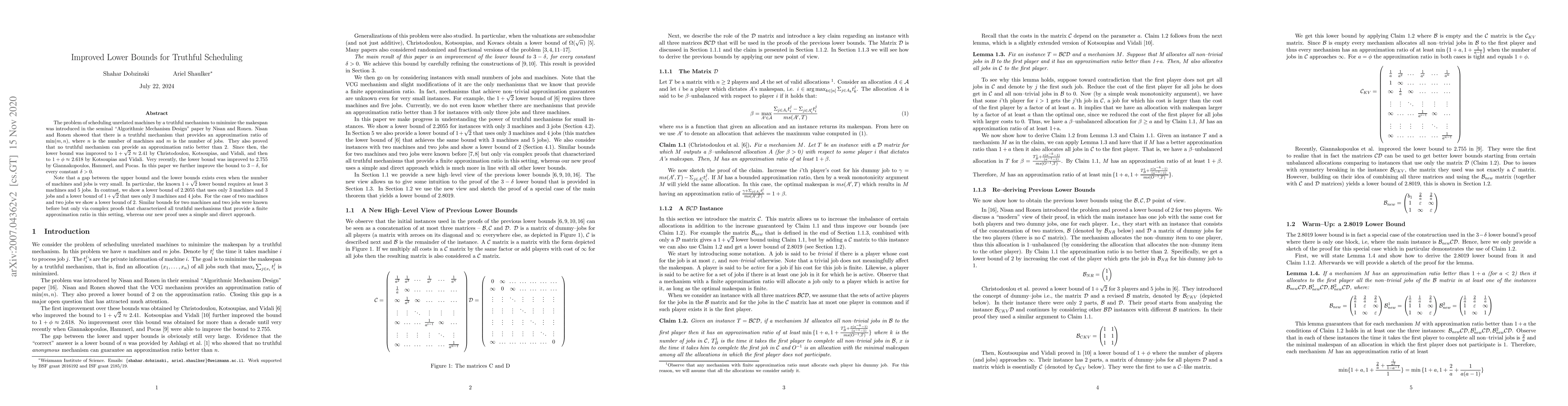 This paper improves the lower bounds for truthful scheduling mechanisms aimed at minimizing makespan on unrelated machines, achieving a new bound of $3-\delta$ for any $\delta>0$. It also presents more efficient proofs for lower bounds using fewer machines and jobs, demonstrating $2.2055$ for three machines and three jobs, $1+\sqrt{2}$ for three machines and four jobs, and $2$ for two machines and two jobs.