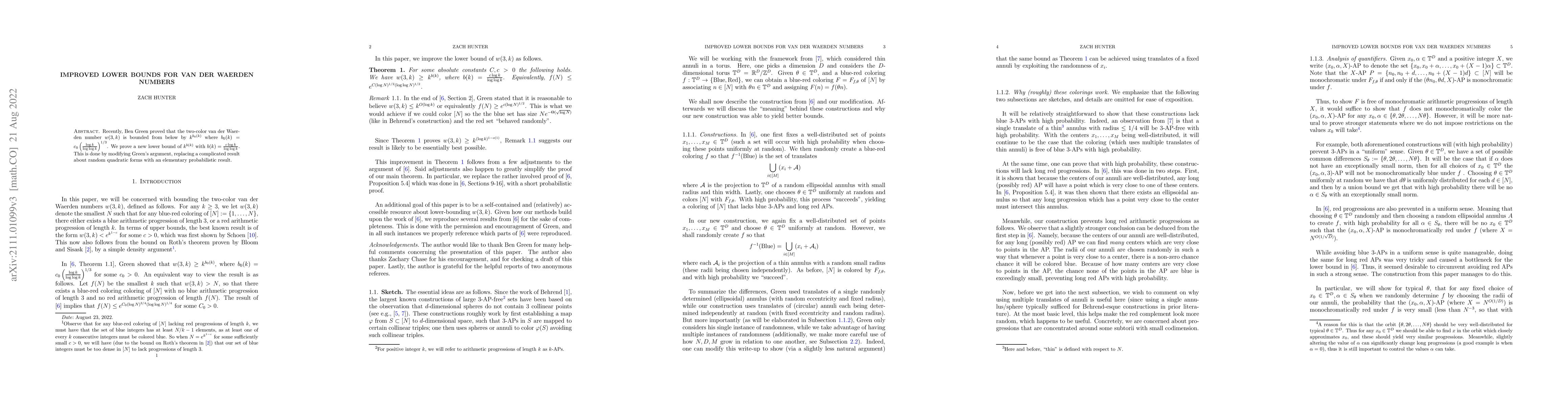 Recently, Ben Green proved that the two-color van der Waerden number $w(3,k)$ is bounded from below by $k^{b_0(k)}$ where $b_0(k) = c_0\left(\frac{\log k }{\log \log k}\right)^{1/3}$. We prove a new lower bound of $k^{b(k)}$ with $b(k) = \frac{c\log k}{\log \log k}$. This is done by modifying Green's argument, replacing a complicated result about random quadratic forms with an elementary probabilistic result.