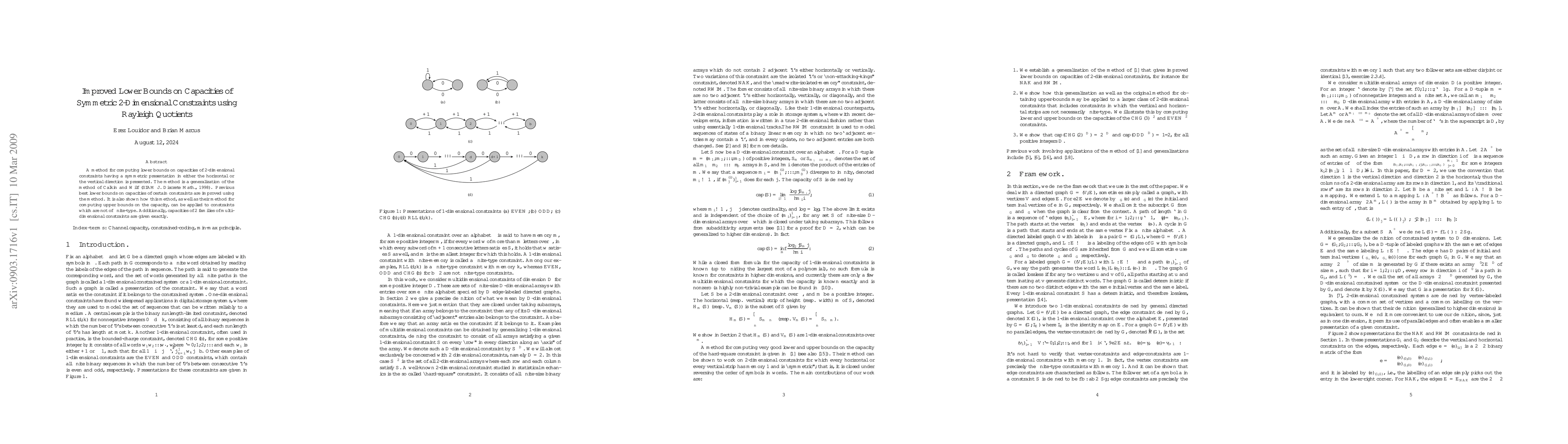 A method for computing lower bounds on capacities of 2-dimensional constraints having a symmetric presentation in either the horizontal or the vertical direction is presented. The method is a generalization of the method of Calkin and Wilf (SIAM J. Discrete Math., 1998). Previous best lower bounds on capacities of certain constraints are improved using the method. It is also shown how this method, as well as their method for computing upper bounds on the capacity, can be applied to constraints which are not of finite-type. Additionally, capacities of 2 families of multi-dimensional constraints are given exactly.